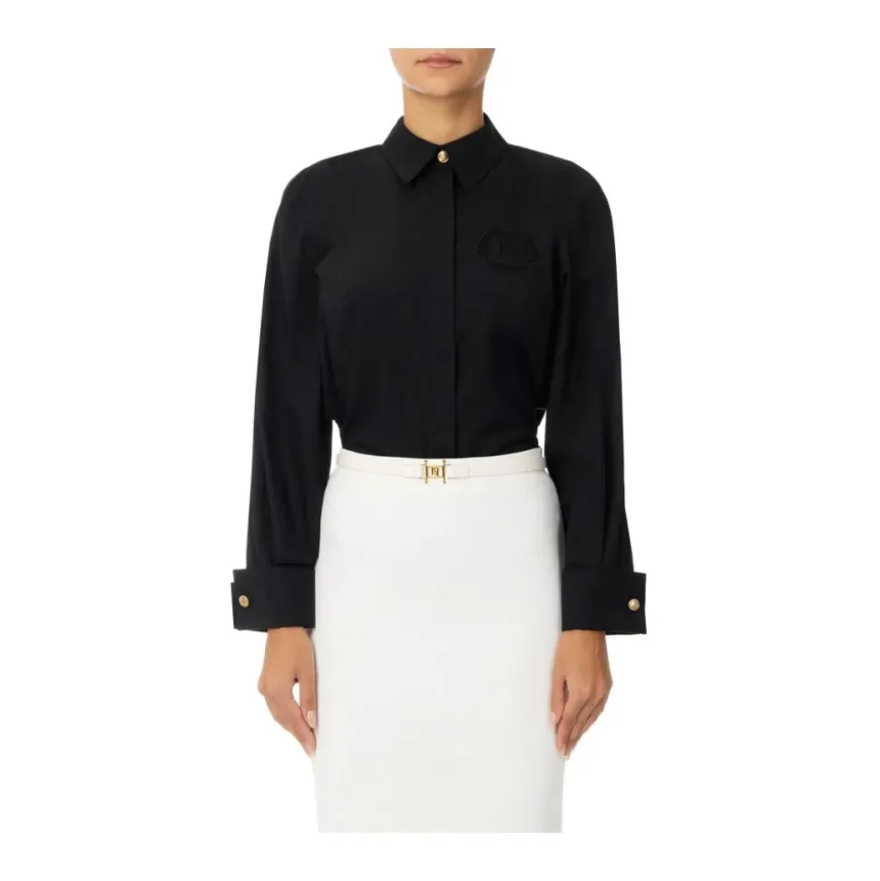 Elisabetta Franchi langærmet poplin skjorte kombinerer struktureret bomuldspoplin med elegante manchetknapper og subtile logo broderier på brystet for et raffineret, poleret look, der er egnet til arbejde eller smarte hverdagsbegivenheder. Vigtige egenskaber: Sort | Bomuldspoplin | Struktureret stof | Manchetknaplukninger på manchetter | Rynker | Logo broderi på brystet | Lange ærmer