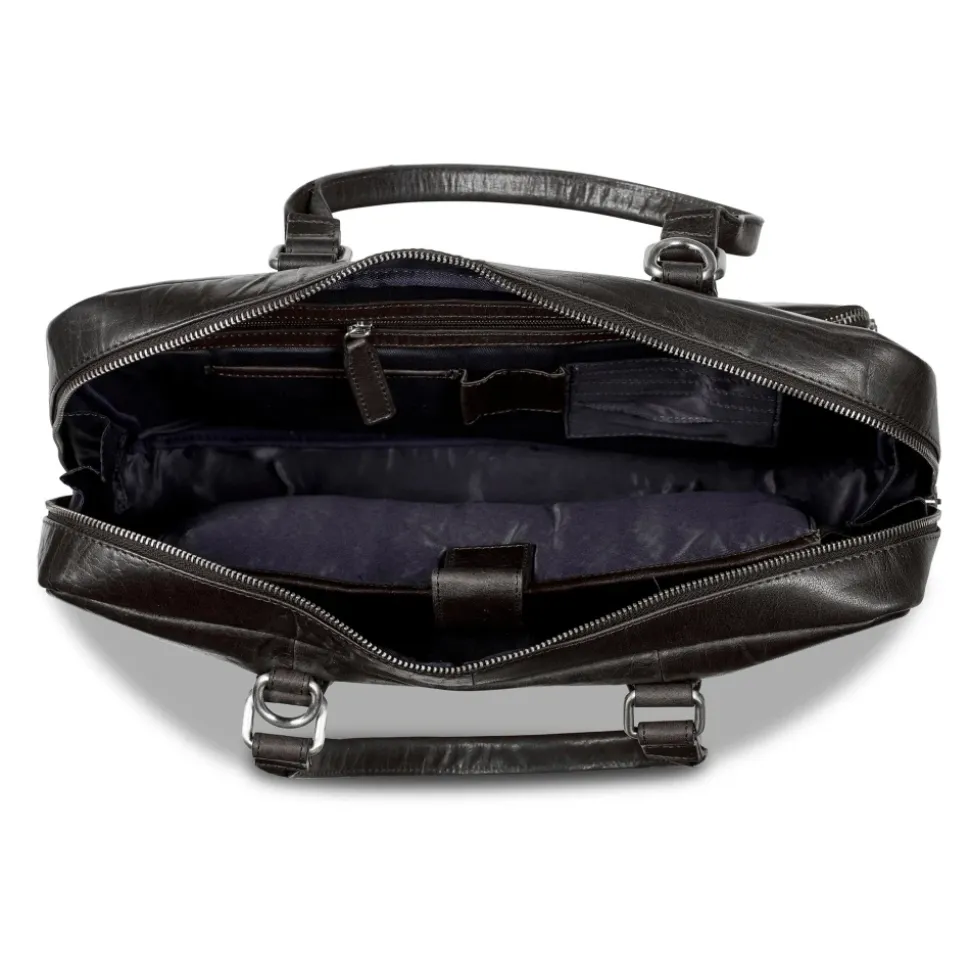 Howard London Laptop Taske Leopold er en rummelig, tidløs lædertaske designet til daglig pendling og korte forretningsrejser. Den har et polstret laptoprum og organiserede indvendige lommer for sikker og praktisk brug. Nøgleattributter: Sort | Buffellæder | Beskyttende polstret laptoprum | Polstret laptoprum | Indstikslommer og lynlåslommer indvendigt | Justerbar og aftagelig skulderrem med læderdetaljer | Lynlåslukning | Lynlås hovedrum | Stor lynlåslomme foran | Børstet sølvfarvet hardware | Tidløs, funktionel silhuet | Mål og pasform: Bredde: 40 cm | Højde: 30 cm | Dybde: 14 cm | Remlængde: 75-125 cm | Passer til op til 15″ laptops | Sammensætning og pleje: Buffellæder | Polyesterforing
