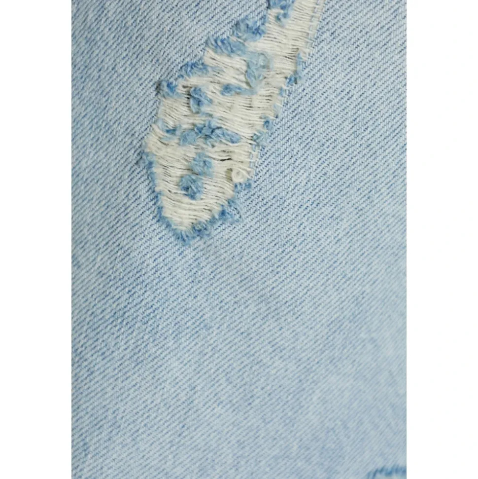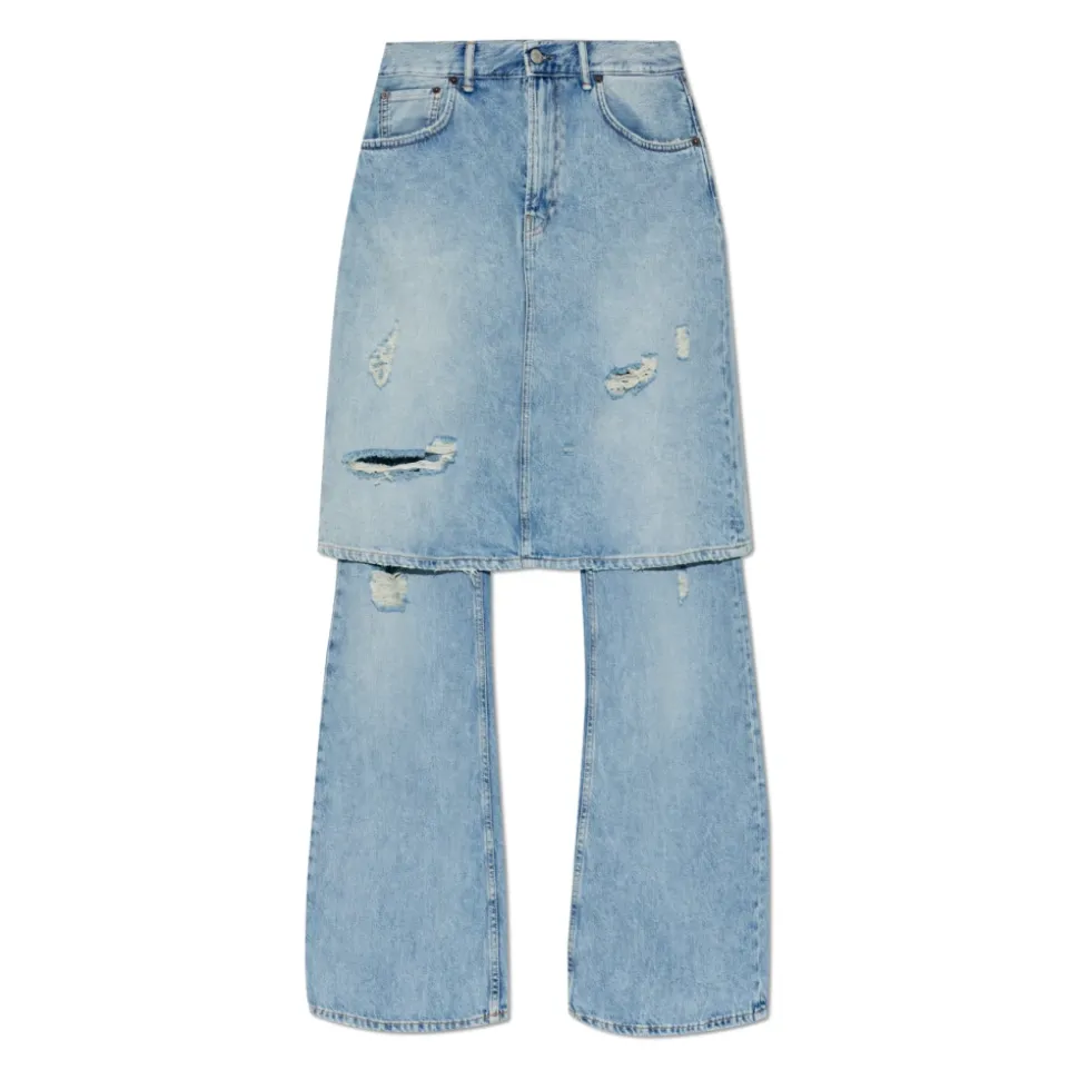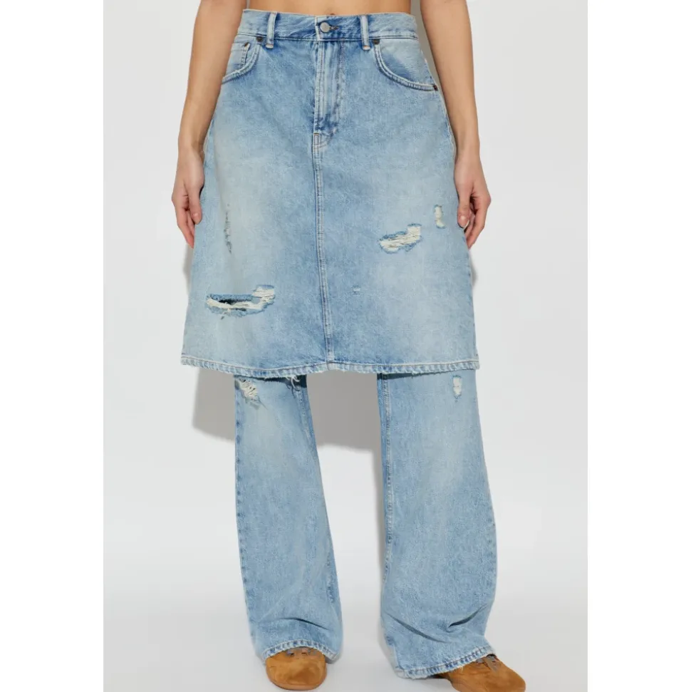 Acne Studios Layered Denim Trousers kombinerer et bredt, lige ben med en imiteret denimnederdel som overlag for et distinkt dobbeltlagslook. Designet fremhæver håndældede detaljer og et læderlogomærke for en runway-inspireret finish. Vigtige egenskaber: Lyseblå | Blå | Bomuld | Stiv denim for struktur | Holdbar finish | Lommer foran og bagpå | Knap- og lynlåsgylp | Imiteret denimnederdel som overlag | Bredt, lige ben med let flare | Flossede kanter og slid | Overlappende klassiske lommer | Diskret læderlogomærke på linningen | Dimensioner & pasform: Modelhøjde: 177 cm | Bryst: 83 cm | Talje: 61 cm | Hofter: 89 cm | Modellen er iført størrelse: 36 | Almindelig pasform | Bredt, let udvidet ben | Sammensætning & pleje: 100% bomuld (skal) | 100% koskind (mærke)
