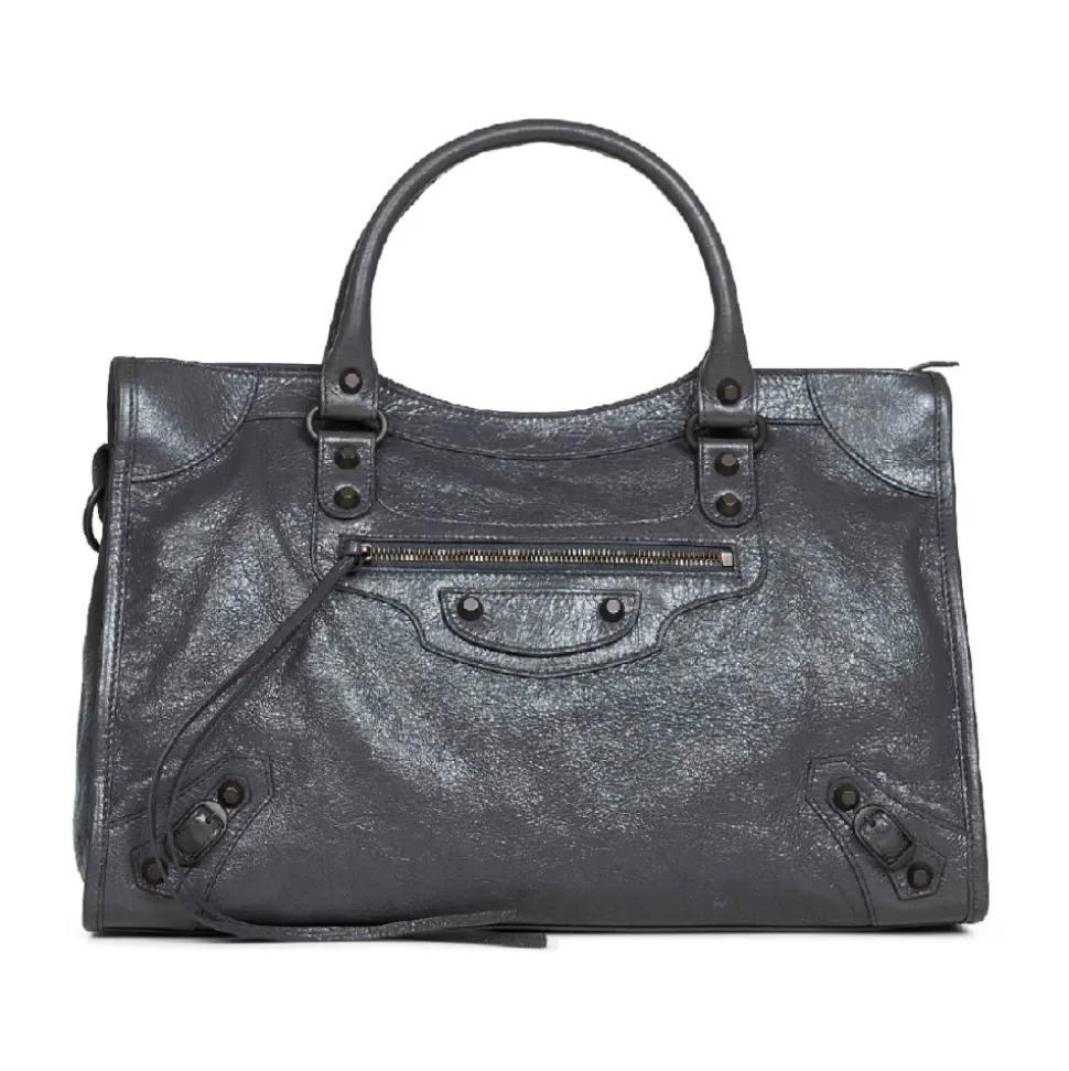 Balenciaga Le City Bag Medium kombinerer Arena Storico lammeskind med messingfarvet hardware og flettede tophanke for en raffineret og alsidig hverdagstaske. Vigtige egenskaber: Vulkansk sten | Lammeskind | Toplynlåslukning | To håndflettede læder tophanke | Justerbar og aftagelig skulderrem i læder | Lynlåslomme foran | Indvendigt hovedrum med lynlåslomme | Bomuldslærredsforing | Knudet læder lynlåstrækker | Metalspænde- og nittedetaljer | Arena Storico lammeskindsfinish | Messingfarvet metalhardware | Mål og pasform: 38,5 x 24 x 13,5 cm | Skulderremmens fald: 52,8 cm | Sammensætning og pleje: 100% lammeskind