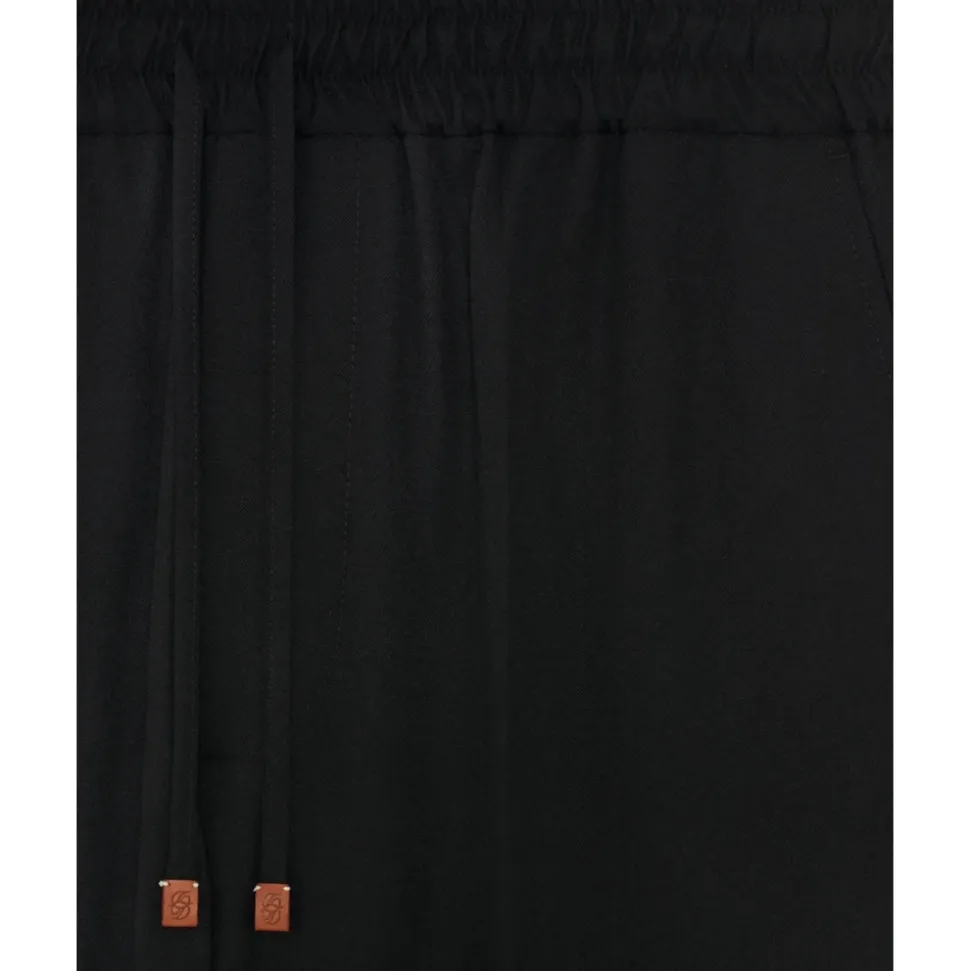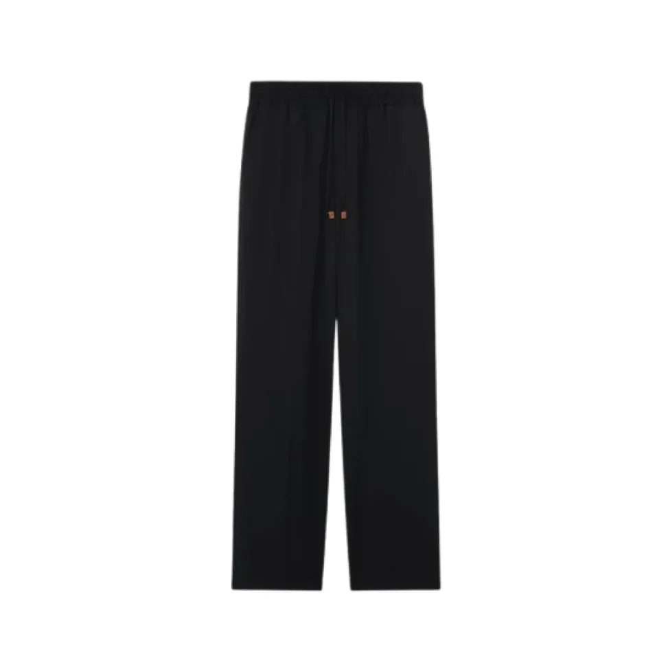 Drole de Monsieur Le Pantalon Droit Laine kombinerer en silhuet med lige ben med en elastisk talje og læderbeklædt snøre for et raffineret, komfortabelt hverdagslook. Vigtige egenskaber: Sort | Uldblanding | Elastisk talje | Snøre med lædersnorender præget med D-detalje | To italienske forlommer | To raglanbaglommer med knapper | Lige ben | Læderprægede snorender | Knaplukket raglan baglommer | Dimensioner og pasform: Lige pasform | Elastisk talje med snøre | Sammensætning og pleje: 45% ren ny uld | 55% polyester