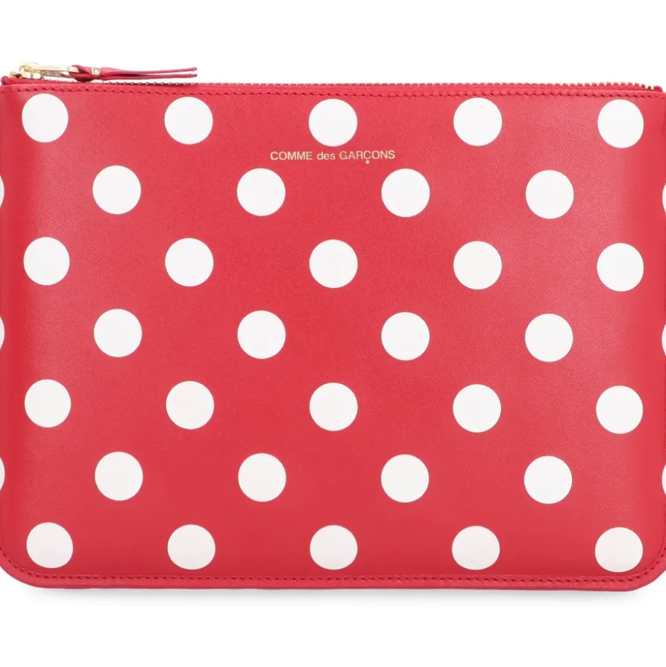 Comme des Garçons Leather Flat Pouch er et kompakt lædertilbehør, der kombinerer en glat finish med et legende polka-dot motiv og guldfarvet hardware, designet til at holde kort og småting sikkert. Nøgleattributter: Rød | Ko læder | Top lynlåslukning | Glat læder | Polka-dot motiv | Guldfarvet metal hardware | Dimensioner & pasform: Bredde: 22,5 cm | Højde: 16 cm | Sammensætning & pleje: 100% Ko læder