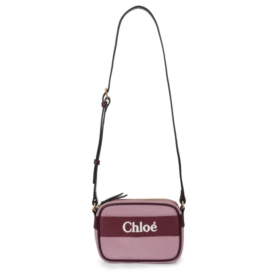 Forhøj din lille piges stil med denne Chloé lilla taske. Med lynlåslukning, justerbar skulderrem og lomme foran er denne taske prydet med en broderet hvidt logo. Mål: 18 cm x 12,5 cm x 5,5 cm. Lavet af 100% polyester.