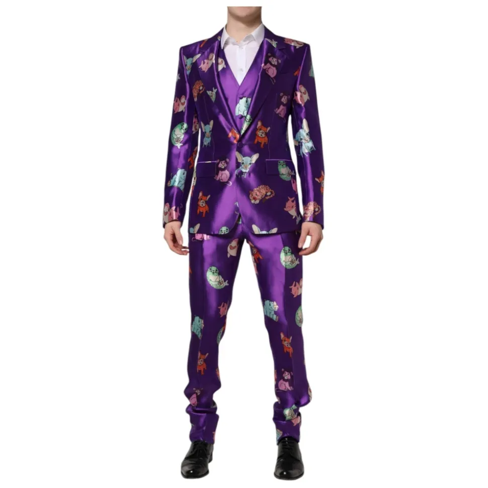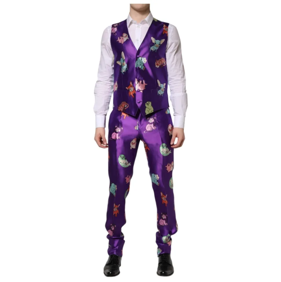 Forkæl din garderobe med denne fantastiske Dolce & Gabbana 3-delt dragt i lilla med et flerfarvet dyreprint. Fremstillet i Italien med 100% silke, denne slim fit dragt har en to-knaps lukning, indvendige lommer og en enkelt slids bagpå. Sættet inkluderer en blazer, bukser og en vest med logo detaljer, hvilket gør det til et virkelig eksklusivt stykke håndværk.