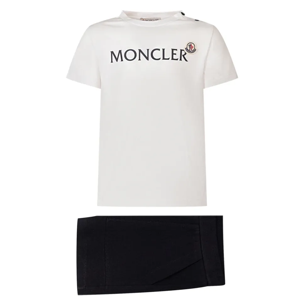 Moncler Logo Cotton Set er et blødt todelt sæt i strækbar bomuldsjersey, der kombinerer en T-shirt med logo og rund hals med shorts med elastisk talje for komfortabel hverdagsbrug eller som gave. Vigtigste egenskaber: Optisk hvid | Bomuld | Strækjersey | Blød fornemmelse | Trykknaplukning ved skulderen | Elastisk taljebånd | Sidelommer | Rund hals | Korte ærmer | Logo detalje | Matchende todelt sæt | Sammensætning & pleje: Del A – Basismateriale: 92% bomuld, 8% elastan | Ribkant ved kraven: 97% bomuld, 3% elastan | Del B – Basismateriale: 92% bomuld, 8% elastan | Maskinvask maks. 30°C (skånsom). Må ikke bleges. Må ikke tørretumbles. Stryg maks. 110°C uden damp. Må ikke renses. Professionel vådrens (skånsom). Tørres fladt i skyggen.