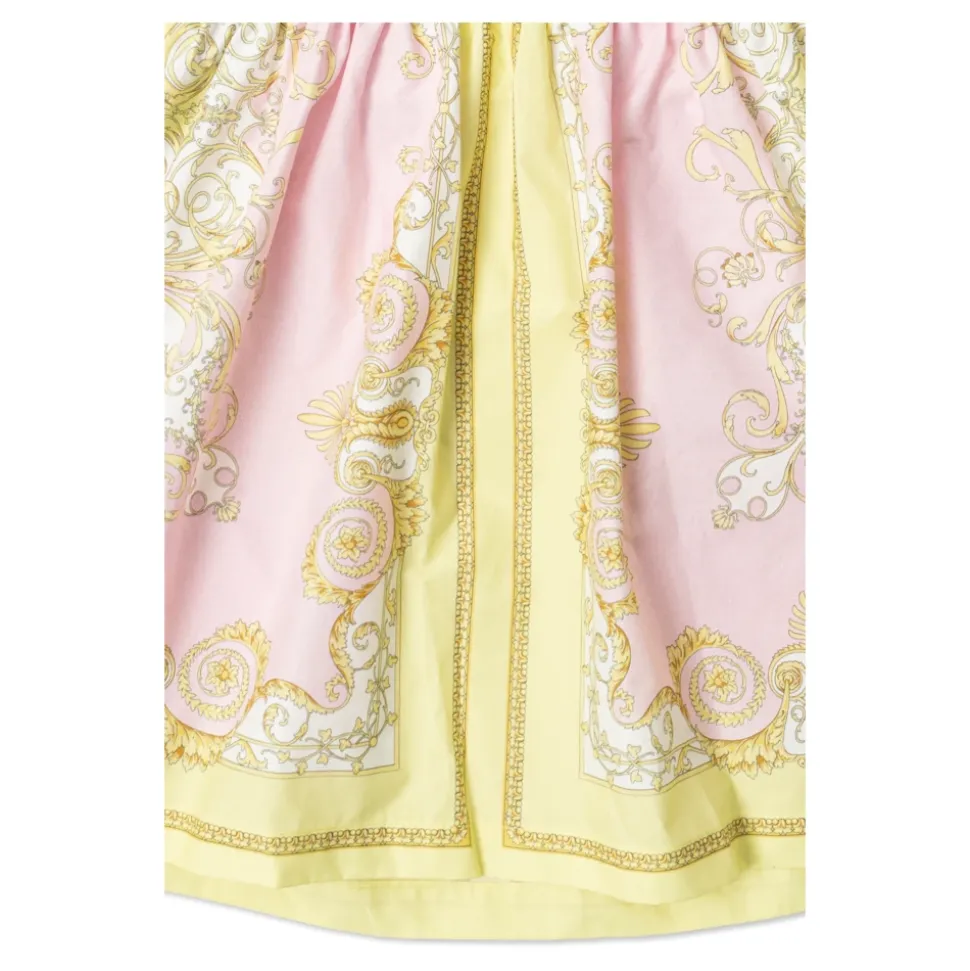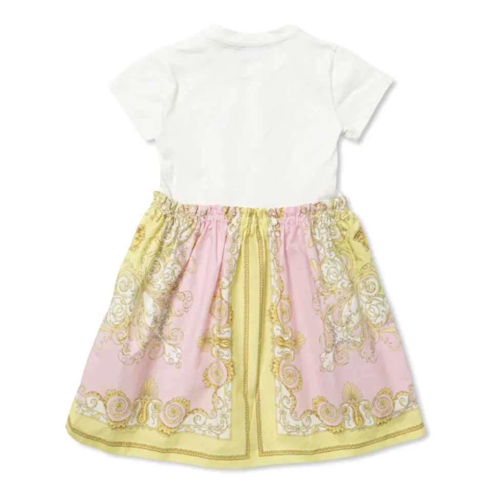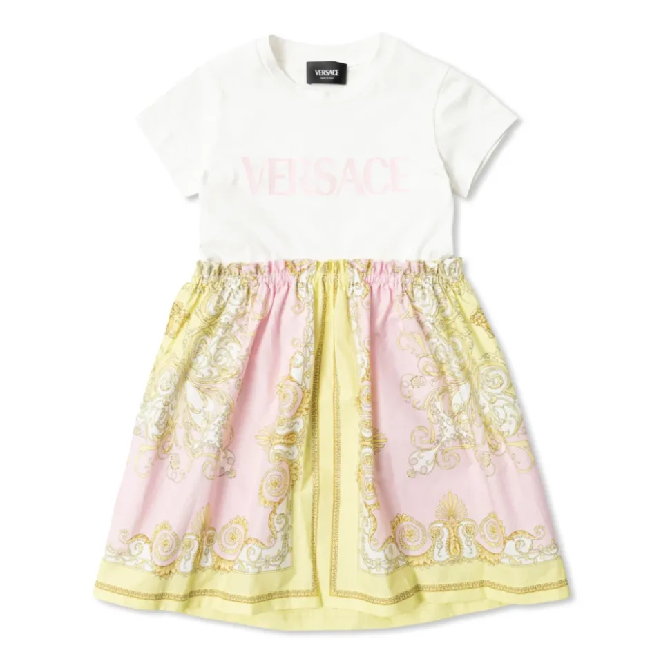 Versace præsenterer Logo Kjolen, en klassisk model, der kombinerer en blød bomuldsstrikket overdel med en subtilt skinnende barokprintet nederdel for et raffineret, festligt look. Vigtigste egenskaber: Hvid | Bomuld | Tætsiddende overdel | Korte ærmer | Bred nederdel | Længde over knæet | Barokprint på nederdelen | Central “VERSACE” inskription | Mærke med “MADE IN ITALY” | Dimensioner og pasform: Klassisk snit | Tætsiddende overdel | Bred nederdel, der ender over knæet | Korte ærmer | Sammensætning og pleje: 100% bomuld