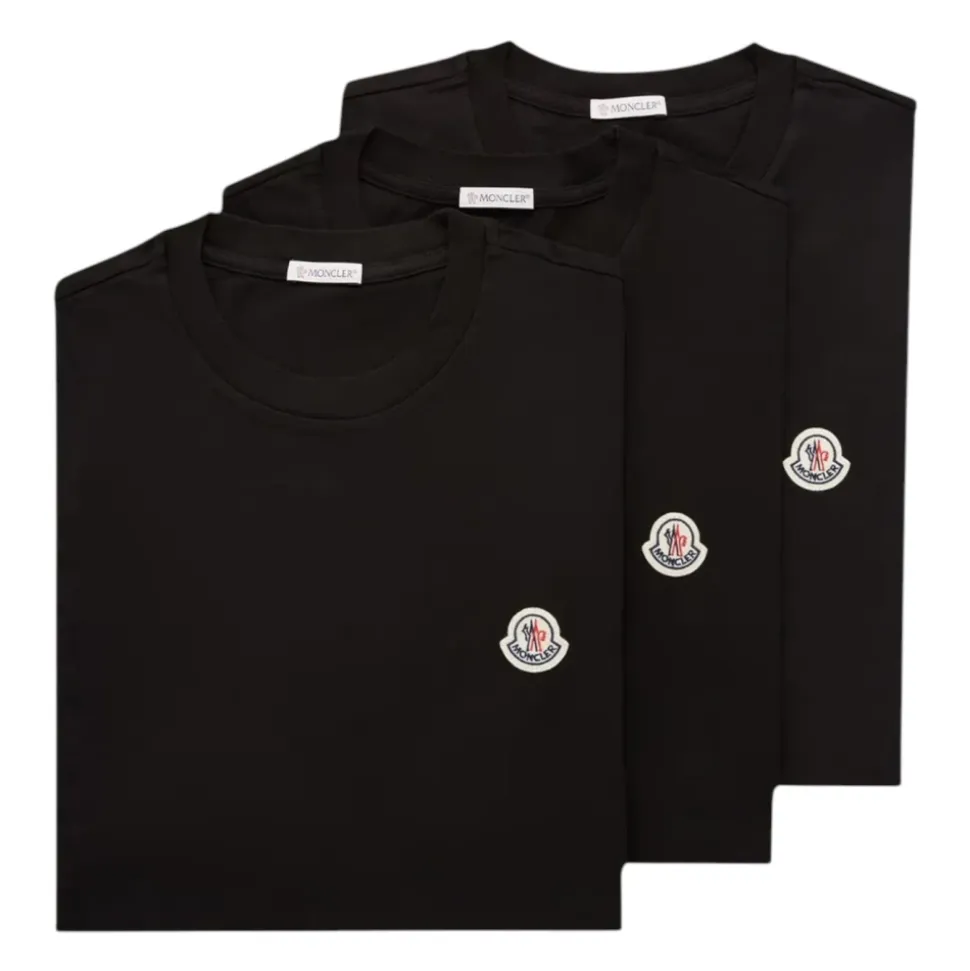 Moncler Logo Patch Bomulds T-shirt (3-pak) er et sæt med tre bløde bomulds T-shirts med rund hals, designet til hverdagsbrug og nem lagdeling. Nøgleegenskaber: Sort | Sort | Bomuldsjersey | Blød følelse | Åndbar | Komfortabel til brug hele dagen | Pakke med 3 | Nem at lagdele | Alsidig til afslappede og smarte outfits | Rund hals | Korte ærmer | Diskret logo patch på brystet | Ensfarvet, minimalistisk design | Mål og pasform: Regular fit – klassisk silhuet, hverken for stram eller for løs | Modellen er 188 cm høj og bærer størrelse L | Sammensætning og pleje: Hovedmateriale: 100% bomuld | Rib: 100% bomuld