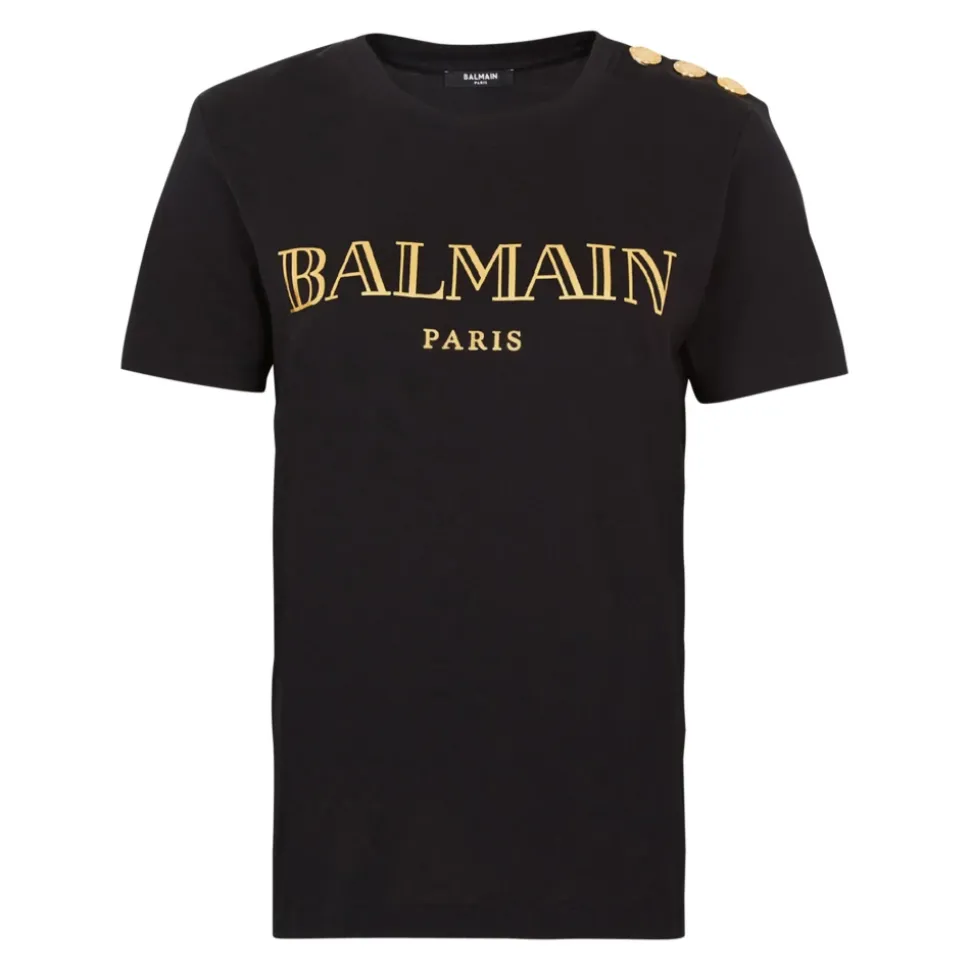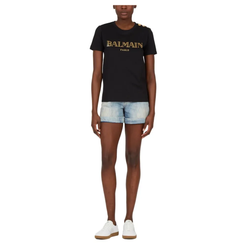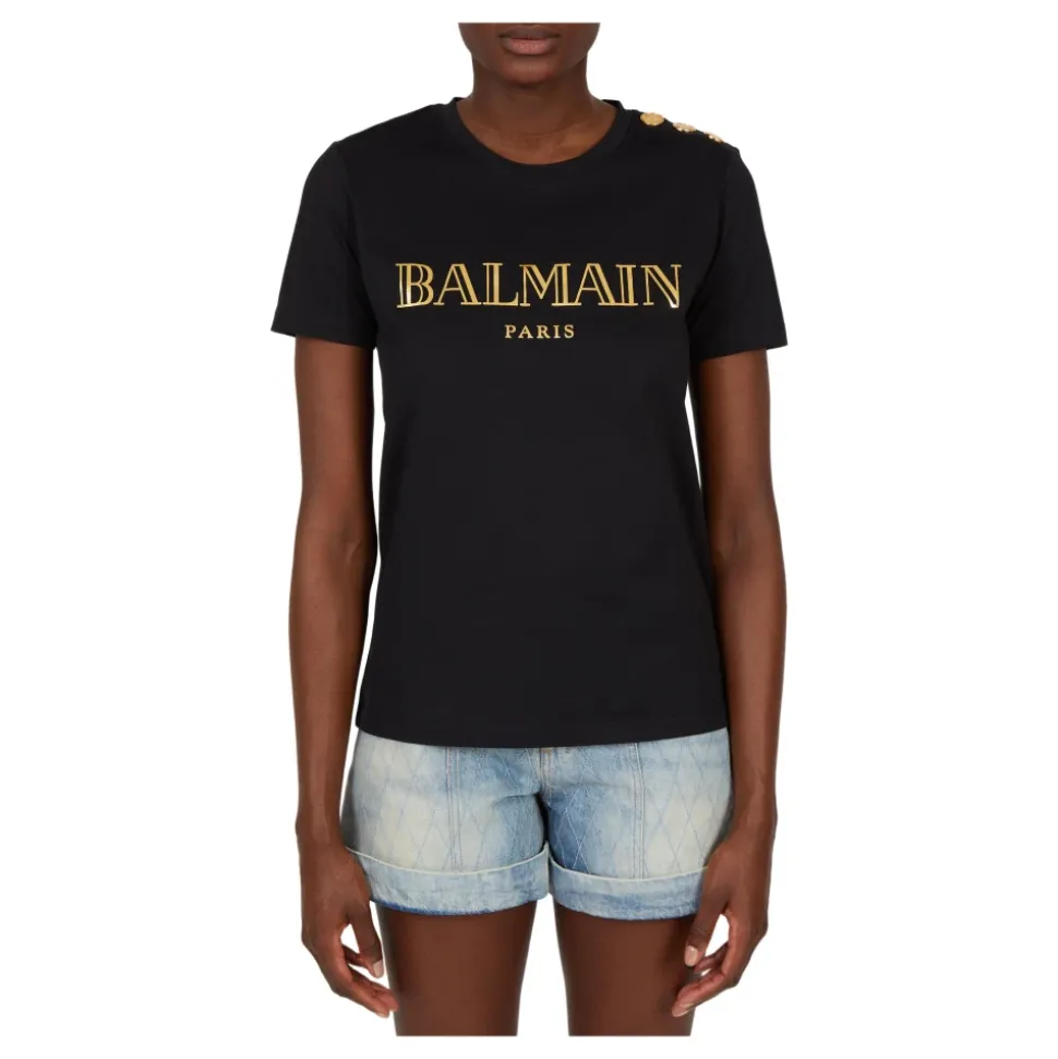 Balmain Logo print T-shirt med knapper er en sort bomulds T-shirt fremstillet i Portugal, med et prominent logo print foran og labelens signatur skulderknapper for et raffineret afslappet look. Nøgleattributter: Sort | Bomuld | Skulderknaplukninger | Rund hals | Korte ærmer | Guldfarvet logo print foran | Signatur prægede knapper på venstre skulder | Dimensioner & pasform: Afslappet pasform | Sammensætning & pleje: 100% Bomuld