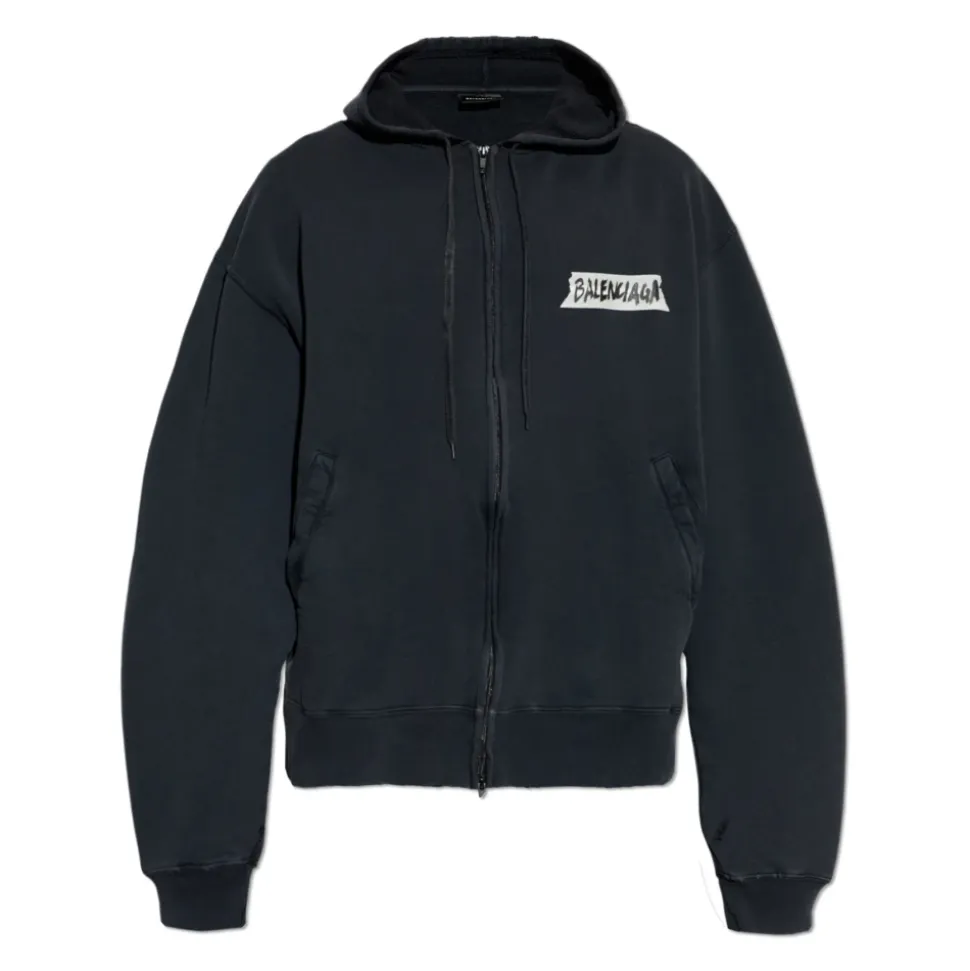 Balenciaga Logo Sweatshirt er en oversized zip-through hoodie, der kombinerer minimalistisk urban stil med et håndmalet hvidt logo, designet til hverdagsbrug og raffinerede streetwear-looks. Vigtige egenskaber: Sort | Bomuld | Hætte med justerbare snore | Fuld lynlåslukning | Frontlommer | Let oversized silhuet | Nedfaldne skuldre | Mat finish | Håndmalet hvidt logo | Dimensioner og pasform: Højde: 185 cm | Bryst: 92 cm | Talje: 74 cm | Hofter: 91 cm | Modellen er iført størrelse: L | Oversized pasform | Sammensætning og pleje: 100% bomuld
