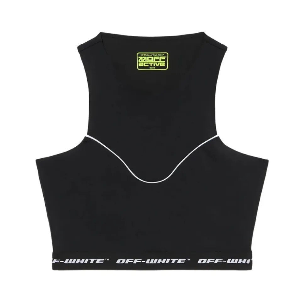 Off-White Logoband Crop Top kombinerer en tætsiddende, ærmeløs crew-neck med et brandet elastikbånd for sikker støtte under træning eller hverdagsbrug. Designet fremhæver en strømlinet silhuet og let pull-on-lukning. Vigtige egenskaber: Sort | Off white | Polyamid | Strækstof | Brandet elastikbånd | Pull-on konstruktion | Crew neck | Ærmeløs | Tætsiddende silhuet | Brandet jacquardbånd | Dimensioner & pasform: Slank pasform | Sammensætning & pleje: 86% polyamid, 14% elastan | Maskinvask kold (max 30°C). Må ikke tørretumbles. Tør fladt. Stryg ved lav temperatur (max 110°C).