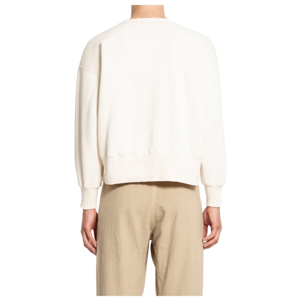 Taiga Takahashi Lot.603 Sweat Shirt genfortolker vintage amerikansk sportstøj i en malet elfenbensfarvet bomuldsjersey, og tilbyder en tekstureret, håndværksmæssigt fremstillet sweatshirt til hverdagsbrug. Nøgleattributter: Hvid | Off white | Bomuldsjersey | Ribkant | Ribmanchetter | Malet finish | Distressed detaljer | Rund hals | Nedhængende skuldre | V-indsats ved halsen | Dimensioner & pasform: Boxy fit | Sammensætning & pleje: 100% bomuld