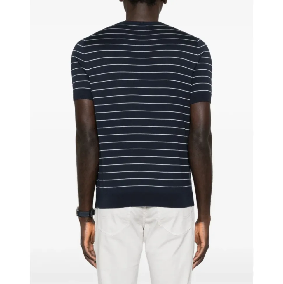 Lardini Maglia girocollo in maglia manica corta a righe er en stribet, kortærmet striktrøje med rund hals fra Lardini, der er velegnet til afslappede, lagdelte looks. Vigtige egenskaber: Blå | Rund halsudskæring | Korte ærmer | Strikket konstruktion | Stribet mønster