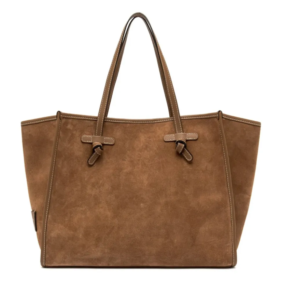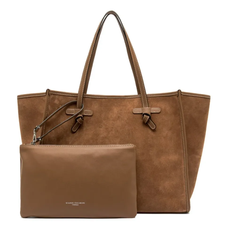 Gianni Chiarini Marcella Tote Bag er en ruskindstaske, der kombinerer en minimalistisk silhuet med praktiske detaljer til hverdagsbrug. Dens ruskindskrop, læderhanke og magnetlukning gør den til en elegant, men funktionel ledsager til daglige gøremål og arbejde. Vigtigste egenskaber: Brun | Ruskind | Magnetlukning | Læderhanke | Indvendig foring | Matchende aftagelig læderpung | Tone-i-tone trim | Minimalistisk silhuet | Rektangulær form | Dobbelte hanke | Dimensioner og pasform: 38x31x16 cm | One size | Sammensætning og pleje: 100% læder