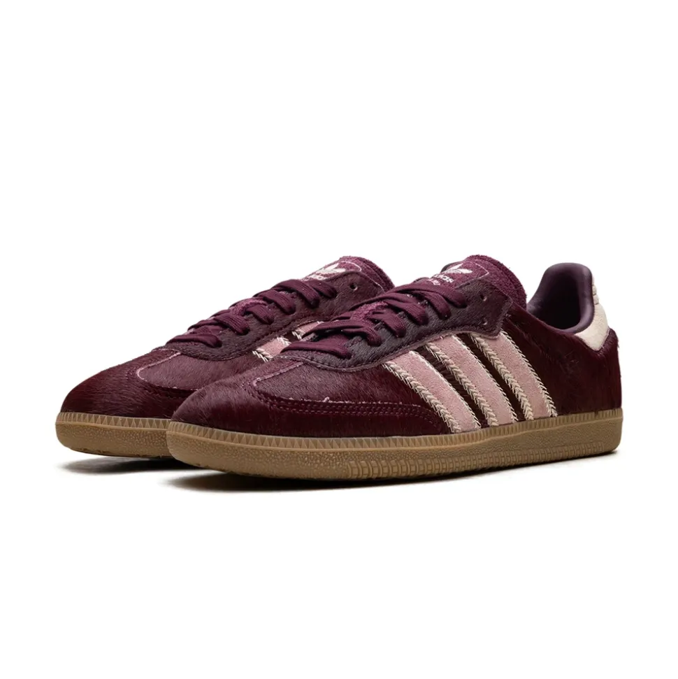 Adidas Samba OG Maroon Sand Strata Pony er en moderne udgave af den ikoniske model, der skiller sig ud med luksuriøse materialer og unik stil. Overdelen er lavet af læder og ruskind i en dyb burgunderfarve, beriget med karakteristiske ponyhår tekstureret læderindsatser, der giver den et unikt præg. Kontrastfulde creme tre striber og Sand Strata detaljer bryder subtilt farveskemaet og tilføjer elegance. Den sidder på en klassisk gummisål for fremragende greb og holdbarhed. Ved at kombinere sport arv med en fashionable finish, er denne model et perfekt valg til både hverdagsbrug og livsstilsstil.