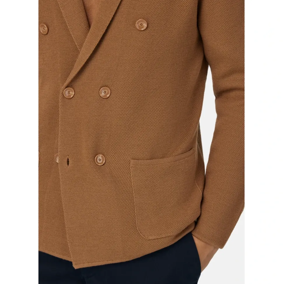 Dobbeltbrystet strikjakke. Lavet af ren merinould. Tøjet har: risstrik effektstrikket og mærkede knapper.