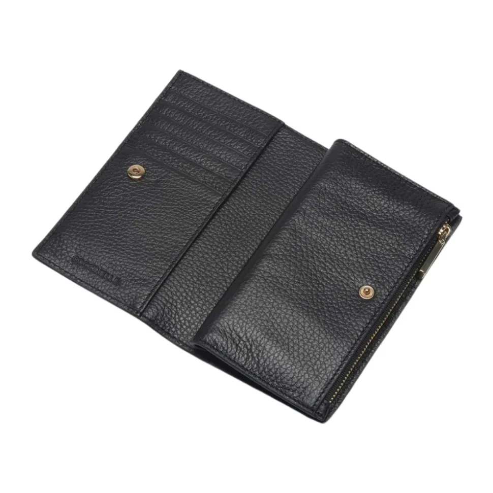 Coccinelle Metallic Soft Wallet kombinerer en kompakt, aflang silhuet med et velorganiseret interiør og metal logo detaljer. Den er designet til hverdagsbrug og holder kort, mønter og sedler pænt organiseret. Vigtige egenskaber: Sort | Læder | Slidstærkt læder | Let at rengøre | Lynlås møntrum | Flere kortlommer | Seddelrum | Organiseret interiør med indvendige kiler | Metal logo bogstaver | Kornet læder tekstur | Aflang, kompakt silhuet | Lyse guldfarvede hardware | Sammensætning & pleje: Læder | Aftørres med en blød klud. Må ikke nedsænkes i vand og undgå direkte varme.