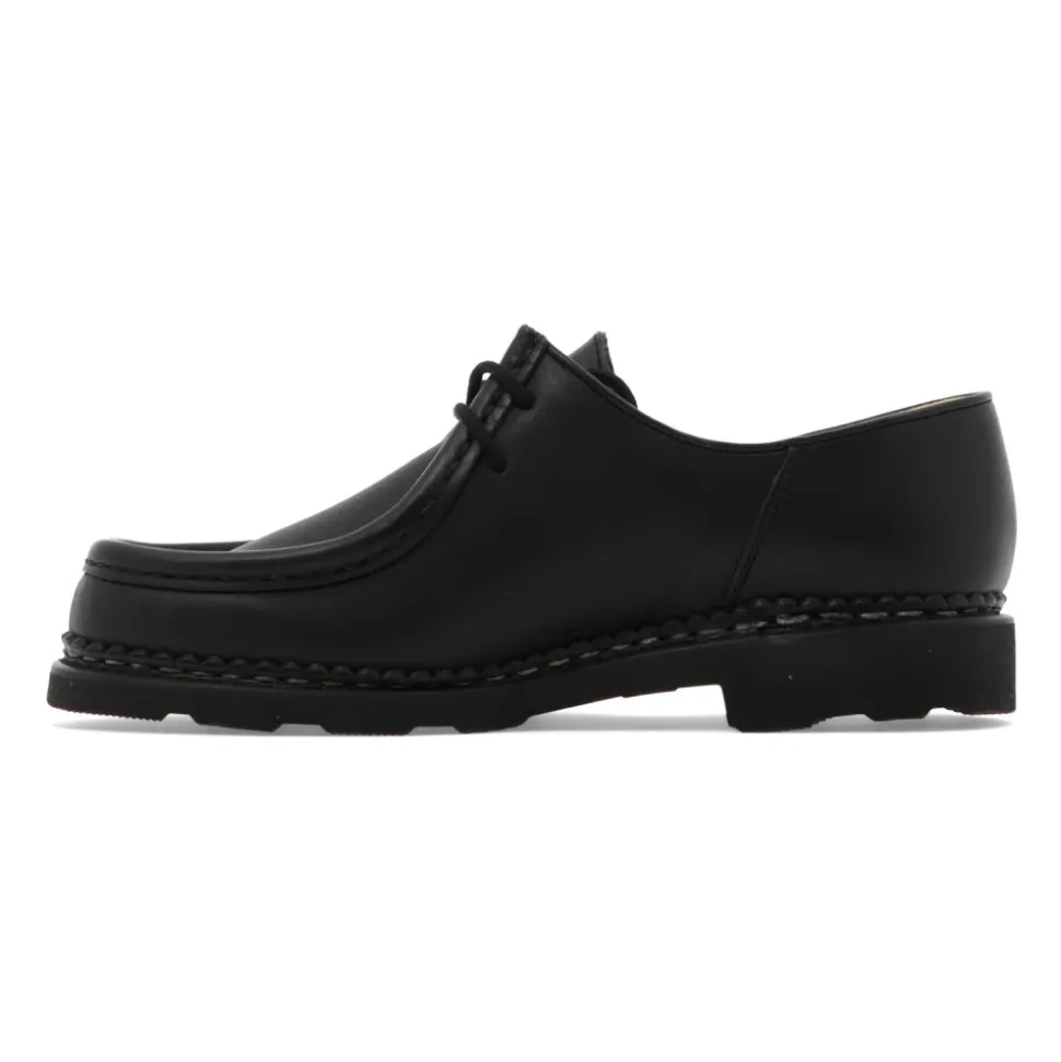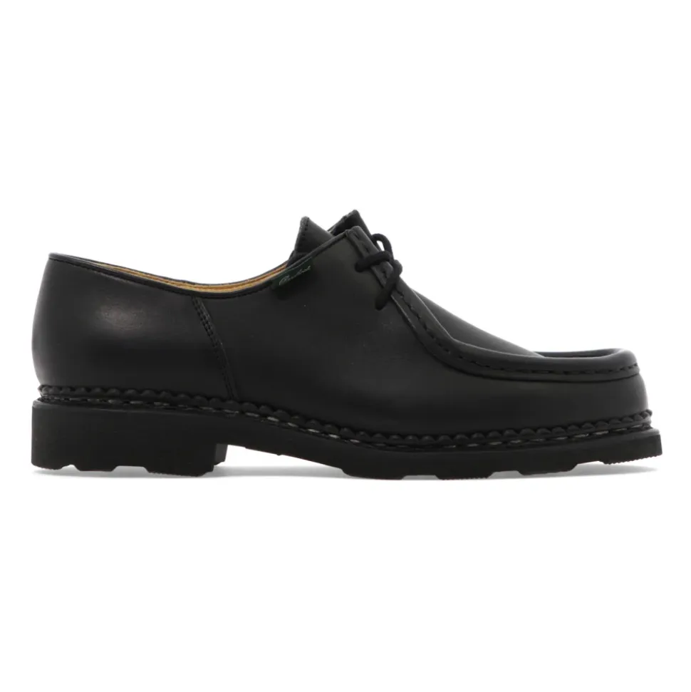 Paraboot Michael Griff bringer klassisk norsk randsyning til en mokkasin med snørebånd. Skoen kombinerer en overdel i kalvelæder og læderforing med en naturgummisål for alsidig brug fra formelle lejligheder til hverdagsbrug. Vigtige egenskaber: Sort | Kalvelæder | Naturgummisål | Holdbar konstruktion | Læderforing | Snørelukning | Kan omformes | Moc-toe (mokkasintå) | Norsk randsyning | Afrundet tå | To-øje snøring | Sammensætning & pleje: Kalvelæder overdel | Læderforing | Naturgummisål | Rengør med en blød børste. Påfør lædercreme eller voks jævnt, og polér derefter for at skinne. Brug neutral polish på randsyede sømme for at beskytte syningerne.