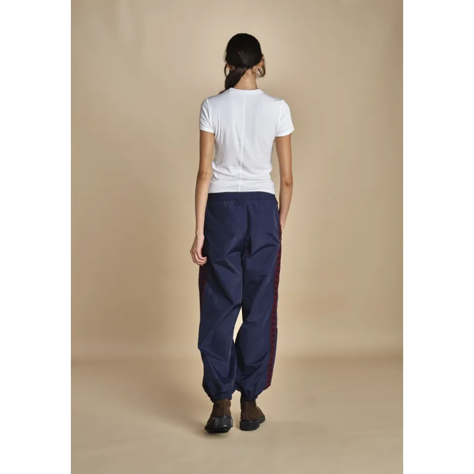 Sea NY Mira Pants er træningsbukser i windbreaker-stil, der kombinerer en afslappet silhuet med hæklede sidekanter og en elastisk talje med snøre. De er designet til let athleisure- og træningstøj. Vigtige egenskaber: Blå | Bordeaux | Nylon | Windbreaker-design | Elastisk talje med snøre | Slip-on | Hæklede kanter langs siderne | Custom ‘Sea’-patch | Dimensioner & pasform: Designet til en afslappet pasform | Modellen er 180 cm høj og bærer størrelse M | Sammensætning & pleje: Yderstof: 100% Nylon | Foring: 100% Bomuld | Dekoration: 50% Uld, 50% Akryl