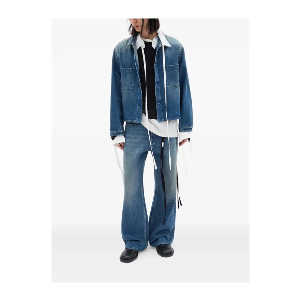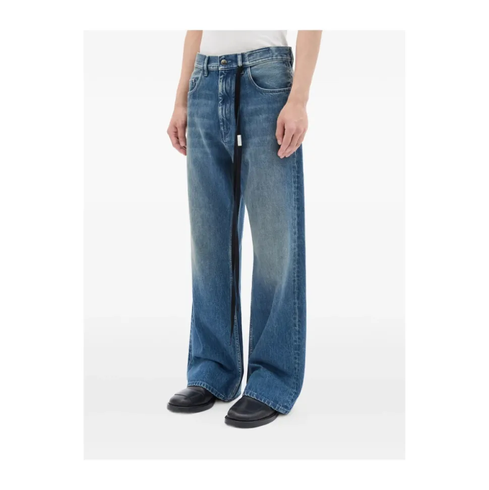 Ann Demeulemeester Modest Afslappede Flared Bukser har et mellemblåt femlommers denimdesign med en afslappet, flared silhuet og rå, frynset kant, ideel til et elegant, afslappet look. Vigtige egenskaber: Blå | Bomuld | Femlommers konstruktion | Lynlåsgylp med knaplukning | Bæltestropper | Flared ben | Rå, frynset kant | Distressed finish | Dimensioner og pasform: Afslappet pasform | Oversize silhuet | Sammensætning og pleje: 100% Bomuld