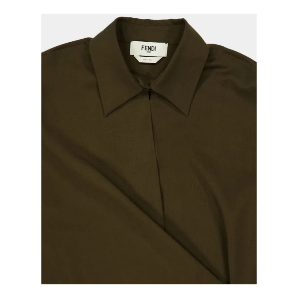 Fendi mohair- og uldskjorte kombinerer en crossover-silhuet med en asymmetrisk sideknaplukning for en elegant draperet effekt. En udskåret halsudskæring og broderet Fendi Roma-manchet giver den en moderne, karakteristisk finish. Nøgleattributter: Grøn | Olivengrøn | Uld og mohair | Asymmetrisk sideknaplukning | Brede manchetter med knapper | Crossover-silhuet | Skjortekrave | Udskåret halsudskæring | Draperet sidedetalje | Lange ærmer | Broderet Fendi Roma-logo på manchet | Sammensætning og pleje: 75 % uld | 25 % mohair | Foring: 100 % silke | Må kun renses