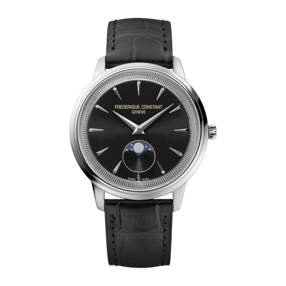 Frederique Constant Moneta Moonphase kombinerer klassisk dress-watch styling med en månefase komplikation og en 37 mm stål urkasse. Den er designet til raffineret hverdagsbrug og formelle lejligheder. Vigtigste egenskaber: Sort | Sølv | Rustfrit stål | Vandafvisende til 5 bar | Safirglas | Quartz urværk (FC-206) med ca. 60 måneders batterilevetid | Månefasevisning | Læderrem med spænde | 37 mm rund urkasse | Riflet mønt-kant indre bezel | Sunray sort urskive med månefase kl. 6 | Dauphine-stil hænder | Dimensioner & pasform: Urkassens diameter: 37 mm | Urkassens tykkelse: 7,65 mm | Rembredde: 18 mm | Sammensætning & pleje: Rustfrit stål | Læder | Safirglas | Sølv | Tør urkassen og glasset af med en blød, fnugfri klud. Hold læderremmen tør og undgå langvarig kontakt med vand. Få uret serviceret af et autoriseret servicecenter.