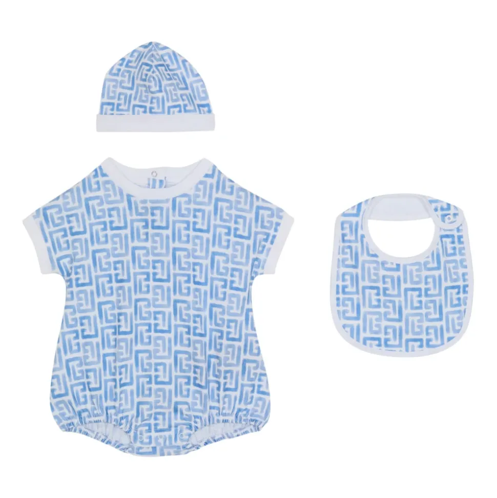 Balmain Monogram 3-delt sæt tilbyder en koordineret body, hue og savlesmæk, der er skabt til hverdagsbrug, med maisonets signaturmonogram og en trykknaplukning for nem påklædning. Vigtige egenskaber: Blå | Bomuld | Trykknaplukning | Matchende body, hue og savlesmæk | Rund halsudskæring | Monogramprint | Sammensætning & pleje: 100% bomuld | Maskinvask ved 30°C