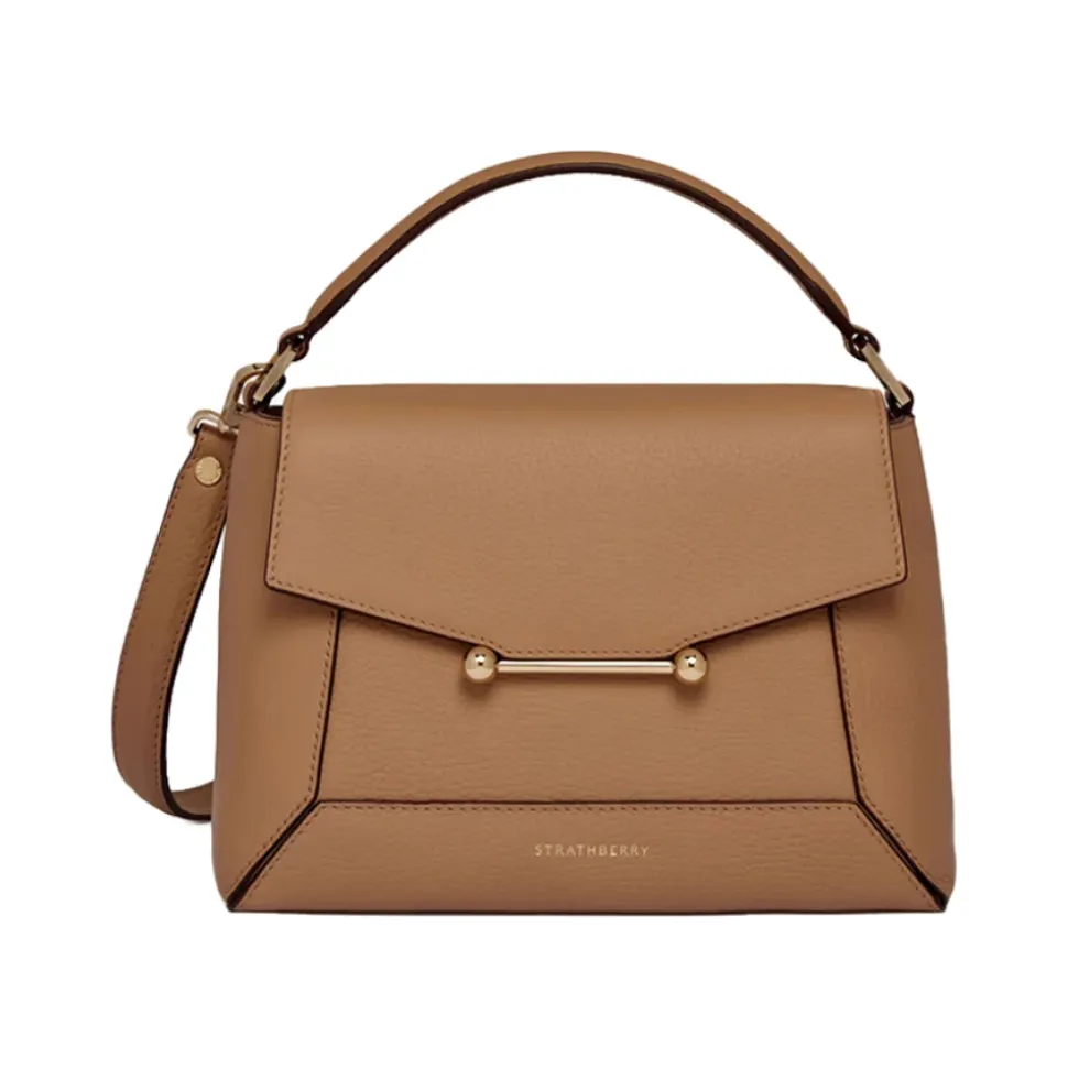 Strathberry Mosaic Håndtaske – en kalveskindslædertaske, håndlavet i Spanien, der kombinerer mosaikinspirerede paneler og en signaturstang med konvertible bæremuligheder til brug fra dag til aften. Nøgleattributter: Brun | Beige | Kalveskindslæder | Aftagelig læderrem | Læder top håndtag | Magnetisk lukning | Indvendig lynlåslomme | Konvertible bæremuligheder (top håndtag eller skulder) | Mosaikinspirerede paneler | Guldfarvet hardware | Signaturstang detalje | Blødt fiberfor | Håndlavet i Spanien | Dimensioner og pasform: Vægt: 0,635 kg (1,4 lbs.) | Skulderrem: 114 cm x 2 cm (44,9″ x 0,8″) | Vist på en model på 180 cm (5’11”) | Konvertibel top-håndtag og skuldertaske | Sammensætning og pleje: 100% kalveskindslæder | Blødt fiberfor | Guldfarvet hardware