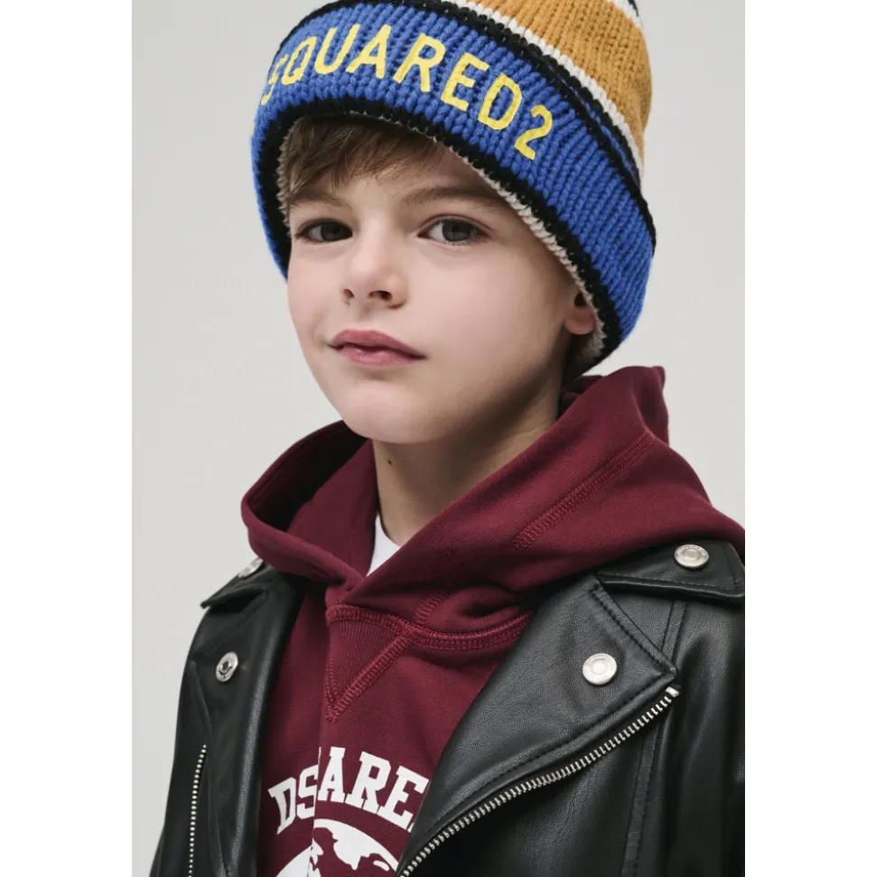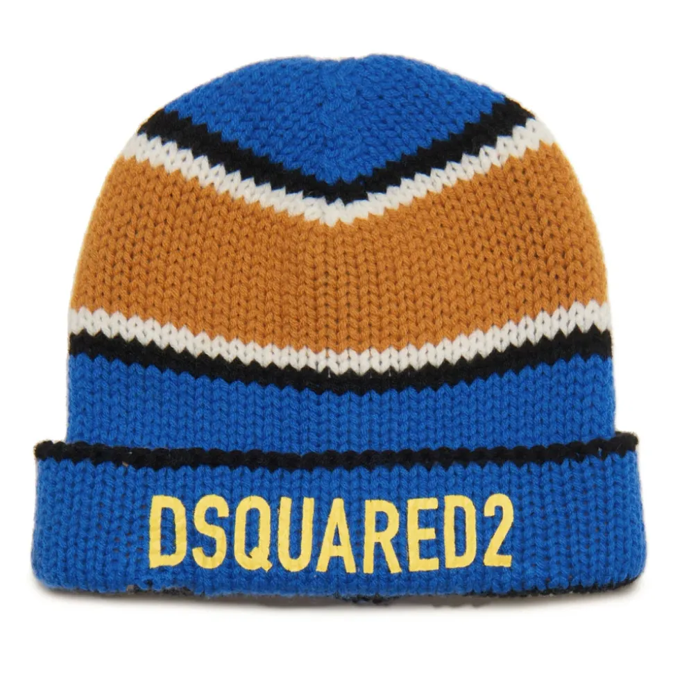 Hold dig varm og stilfuld med denne multifarvede uldhue fra Dsquared2. Med et logo i kontrastfarve på forsiden er dette afslappede tilbehør perfekt til hverdagsoutfits og mindre formelle lejligheder. Produkt detaljer: Princess Blue | Blue | Multifarvet | 100% Uld | Logo i kontrastfarve | Horisontalt stribemønster | Opsmøget kant | Rund krone | Pull-on model | Dimensioner og pasform: Fås i tre størrelser | Sammensætning og pleje: 100% Uld