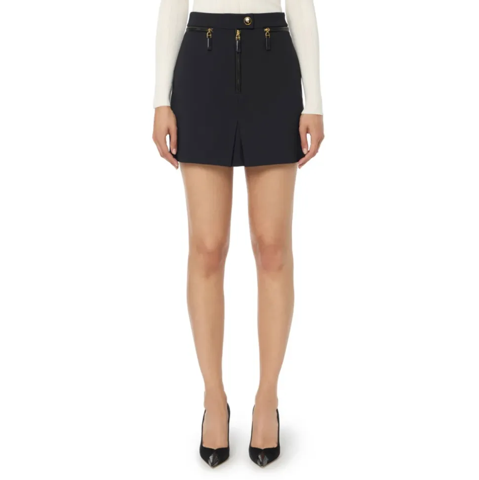 Elisabetta Franchi nederdel i dobbeltlags crepe med lynlås præsenterer en slank mini-silhuet med raffinerede logo- og kvastdetaljer. Den kombinerer en struktureret form med satinfor for et sofistikeret look, der er velegnet til særlige lejligheder eller et poleret, afslappet outfit. Nøgleattributter: Sort | Dobbelt crepe | Lynlås med træklap | Skjult sidelås | Tone-i-tone kvastdetaljer | Emaljeret logoknap | Plissé, der definerer volumen | Monogram satinfor | Lynlåse indrammet af nappa læderkanter | Mål og pasform: Længde: 38 cm (IT størrelse 40) | Slim fit | Mini længde | Sammensætning og pleje: 96% polyester | 4% elastan