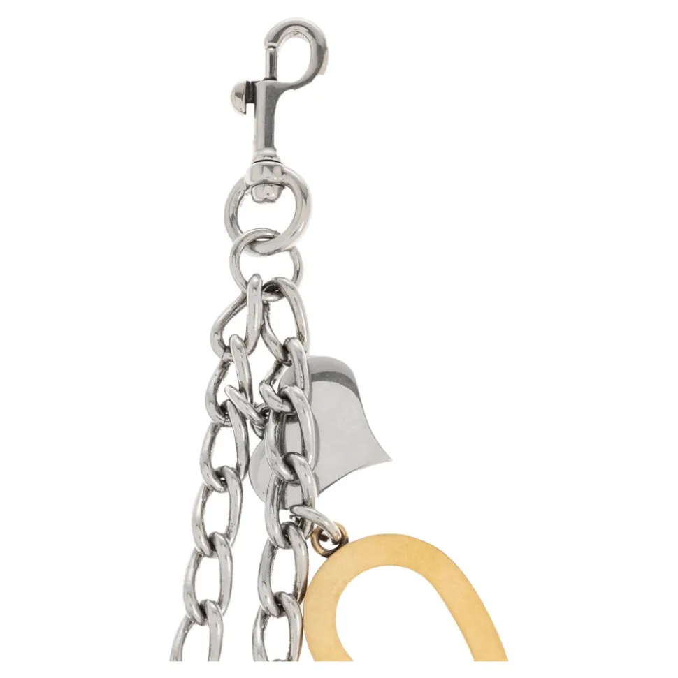 Balenciaga nøglering med charms kombinerer en robust sølvkæde og karabinhage med dekorative charms, der giver en raffineret, bærbar accent. Stykket skiller sig ud med sin blanding af sølv- og gulddetaljer, graverede hestesko og to hjerteformede charms – den ene sat med røde sten. Nøgleattributter: Grå | Sølv | Stål | Holdbar konstruktion | Højglans metalfinish | Karabinhagelukning for nem fastgørelse | Kan bruges som nøglering eller taske charm | Kontrasterende sølv- og guldaccenter | Guld hestesko charms med indgraveret designernavn | To hjerteformede charms – en med røde sten, en med glat finish | Robust kæde og polerede hardware | Sammensætning & pleje: Stål | Jern | Messing | Krystal