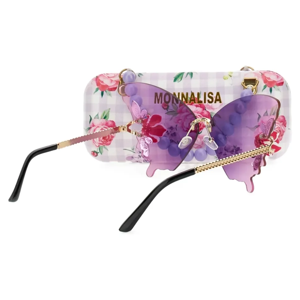Monnalisa Occhiali Farfalla er sommerfugleformede solbriller, der tilføjer en legende silhuet til hverdagsoutfits. Den karakteristiske sommerfuglestel gør dem til et stilfuldt valg af solbriller. Vigtige egenskaber: Lilla | Glicine | Sommerfugleformet stel