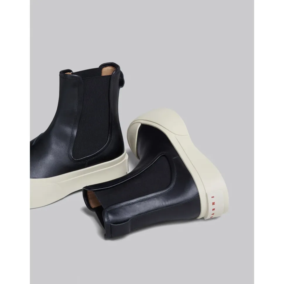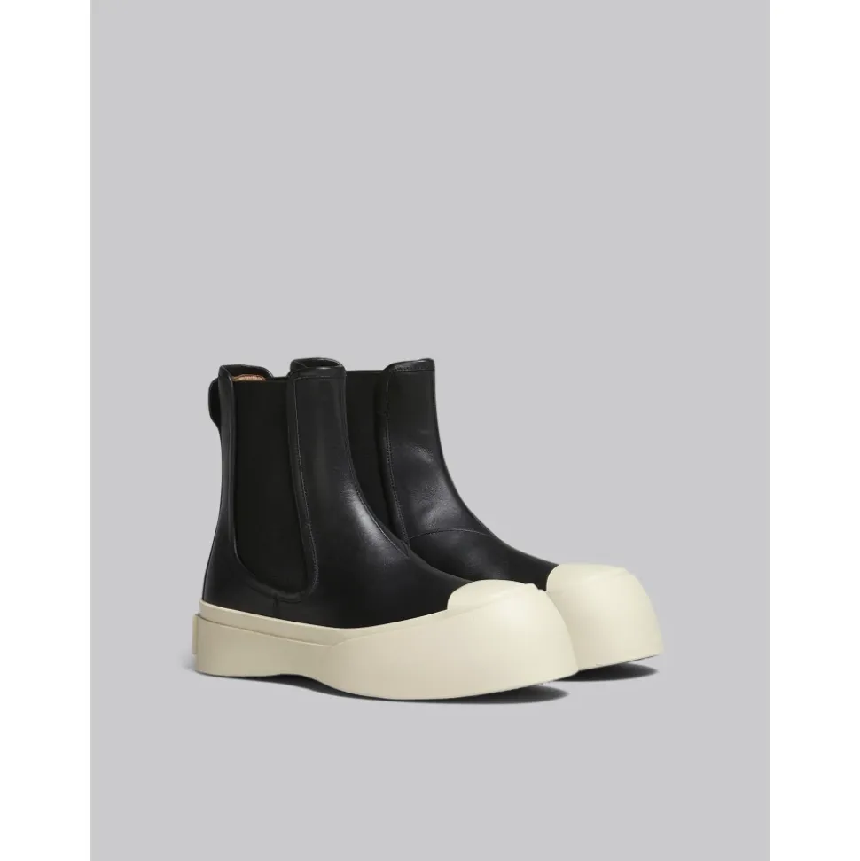 Pablo Chelsea Støvlen fra Marni tilbyder et elegant og moderne design med sin sorte nappa læderkonstruktion og chunky platformssål, perfekt til at tilføje et strejf af sofistikering til ethvert outfit. Produkt detaljer: Sort | Nappa Læder | Elastiske sider | Chunky platformssål | Marni logo på bagsiden | Dimensioner og pasform: Normal pasform | Sammensætning og pleje: Overdel: 100% Nappa Læder | Sål: Gummi | Renses med en blød klud