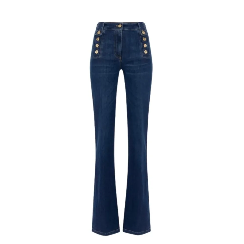 Opgrader din denimkollektion med disse Elisabetta Franchi boot-cut jeans til kvinder. Med en palazzo-konstruktion skiller disse bukser sig ud med sidebæltestropper prydet med guldmetallogo-knapper. Komplet med lommer og etiket på bagsiden tilbyder disse jeans en regular fit for et tidløst look.