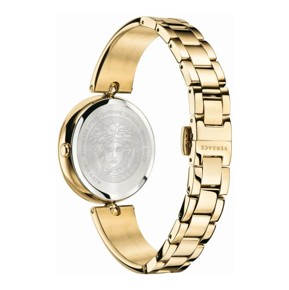 Versace Palazzo-uret kombinerer et guldfarvet urarmbånd i rustfrit stål med en sort urskive og schweizisk fremstillet kvartspræcision. Det leverer et luksuriøst statement-piece, der er velegnet til både hverdagsbrug og formelle lejligheder. Nøgleattributter: Sort | Schwarz | Rustfrit stål | Swiss Made | Vandafvisende til 5 atm | Ridsefast safirglas | Kvarts urværk | Butterfly foldespænde | Guldfarvet urarmbånd i rustfrit stål | Sort urskive | Ikonisk Medusa-logo | 39 mm urkasse | Dimensioner & pasform: Urkassediameter: 39 mm | Sammensætning & pleje: Rustfrit stål | Safirglas | Kvarts urværk
