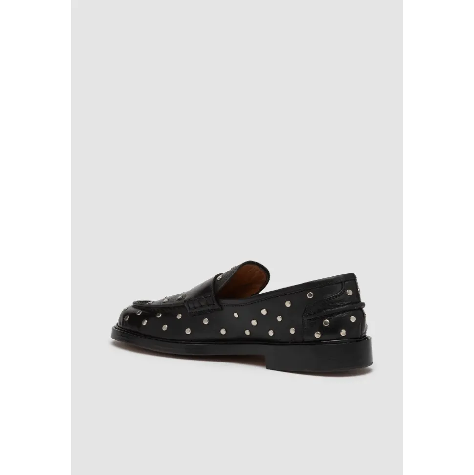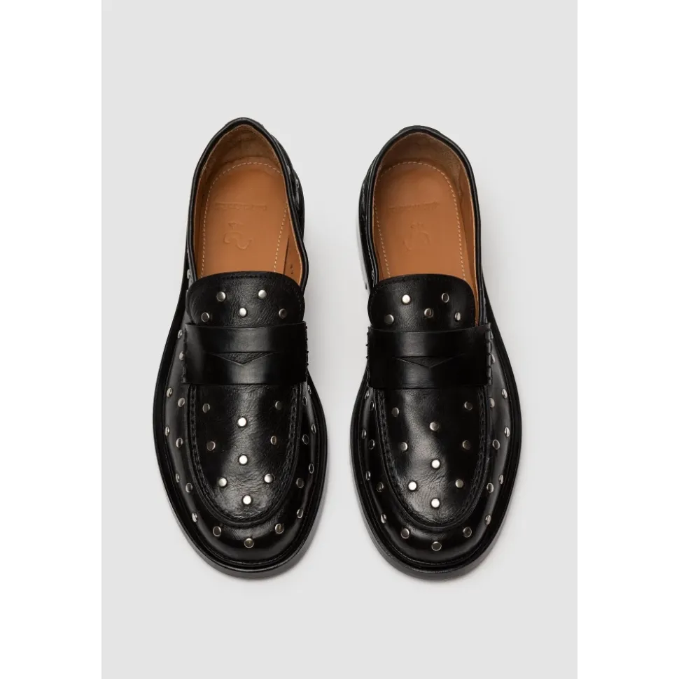 Løft din stil med disse Elia Maurizi Penny Loafers, håndlavede med fint kalveskind og nappa inderforing for ultimativ komfort. Det minimalistiske design fremhæves af sølv studs på blødt sort læder, hvilket gør dem perfekte til de varme sæsoner. Produkt detaljer: Sort | Vegetabilsk garvet kalvelæder | Sølv studs | Minimalistisk design | Sacchetto konstruktion | Dimensioner og pasform: Normal pasform | Sammensætning og pleje: Vegetabilsk garvet kalvelæder | Vegetabilsk garvet nappa | Ikke specificeret