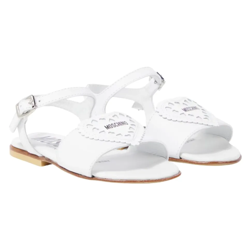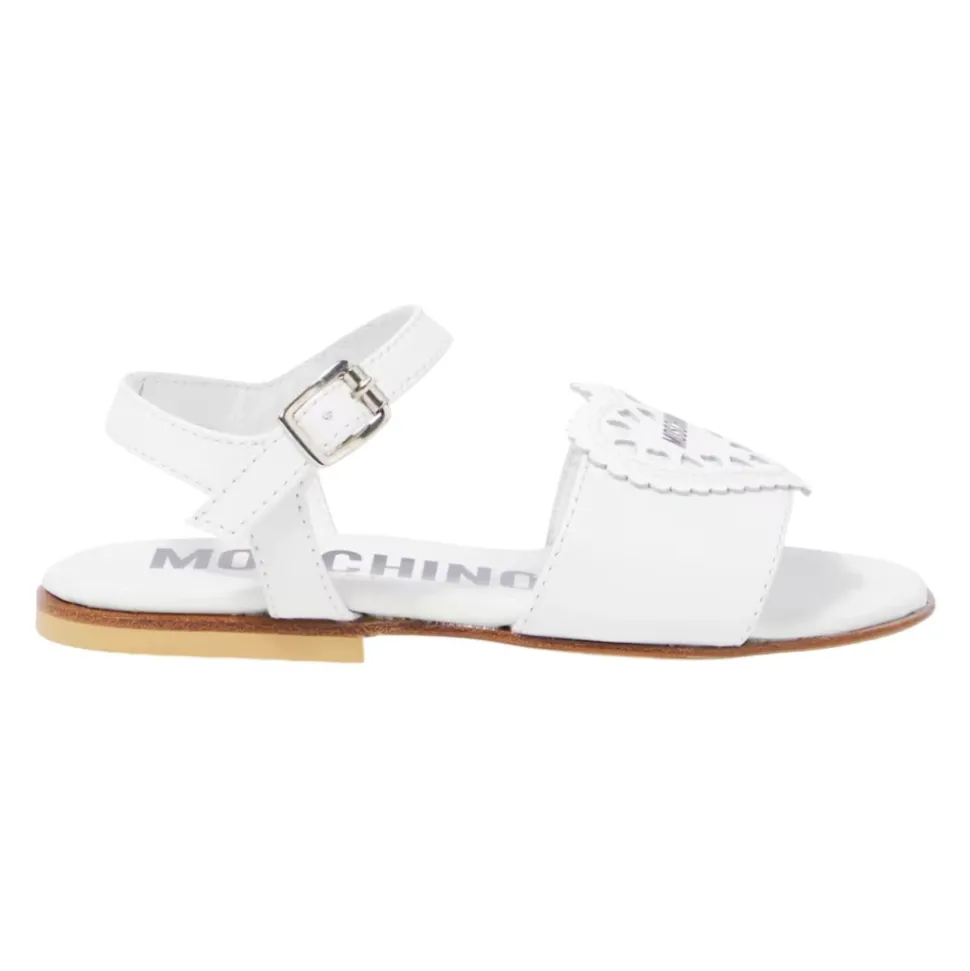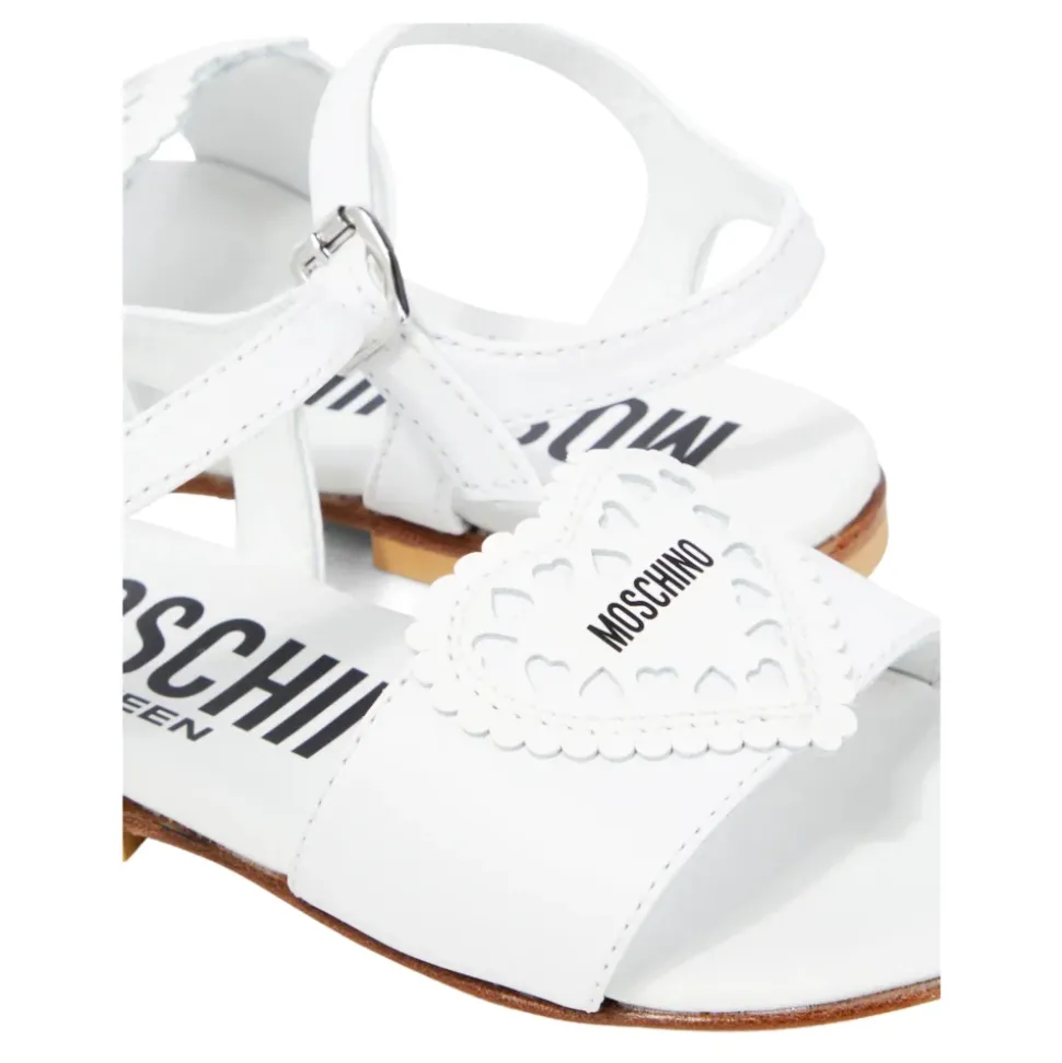 Moschino Perforated Heart Leather Sandal kombinerer en ren, hvid lædersilhuet med en perforeret hjerte-detalje og kontrasterende sort logo. Den er fremstillet i Italien og designet til nem hverdagsbrug med en justerbar ankelrem for sikker pasform. Vigtigste egenskaber: Hvid | Læder | Justerbar ankelrem | Perforeret hjerte-detalje | Kontrasterende sort logo | Rund tå | Kontrasterende logo indersål | Sammensætning & pleje: Læder | Ægte lædersål