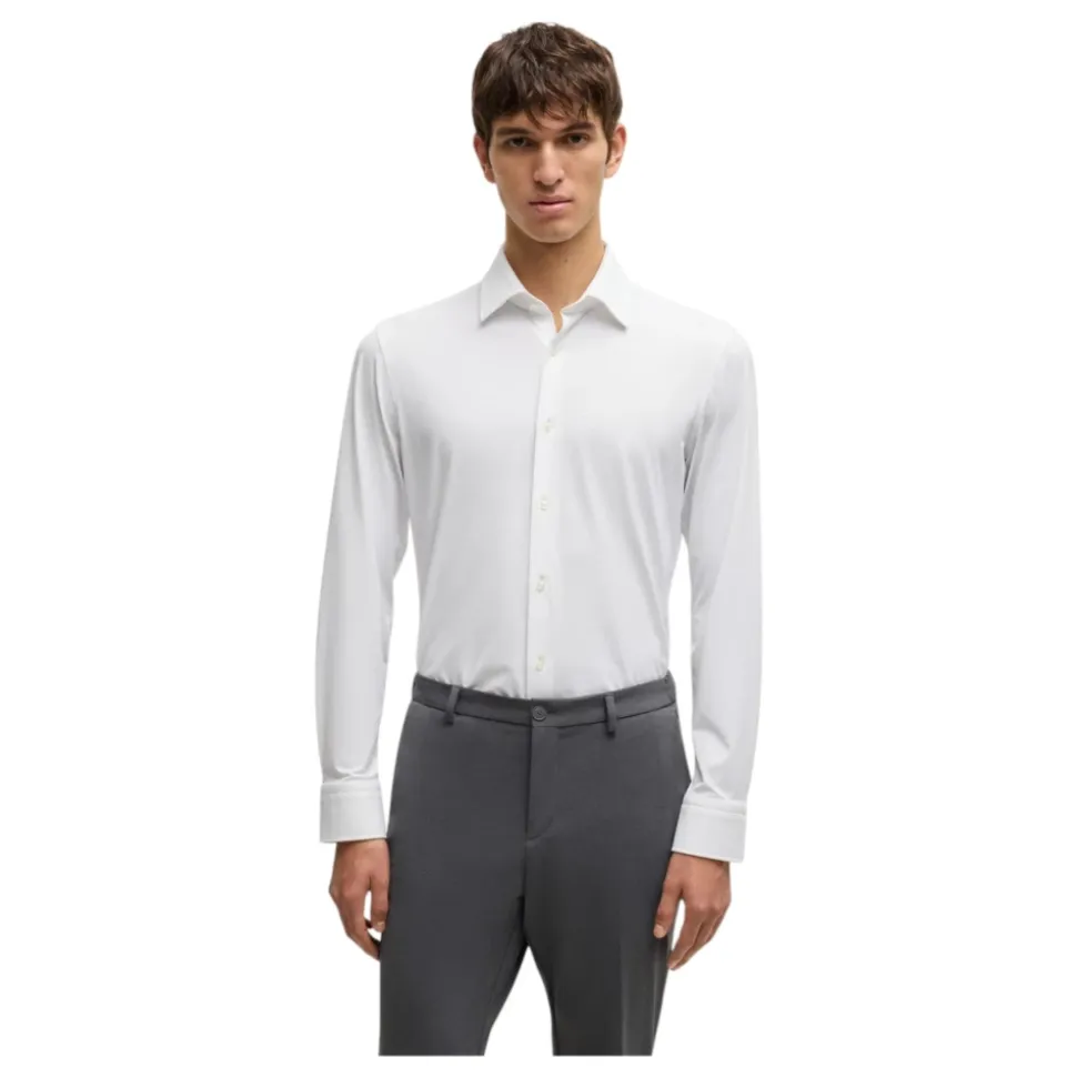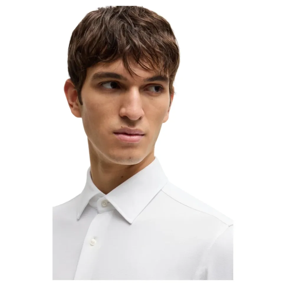 Forbedr din forretningsgarderobe med denne avancerede Hugo-formelle skjorte med fugtstyring fra BOSS Menswear. Fremstillet af struktureret italiensk fremstillet performance-stretch stof, denne slim fit skjorte med Kent-krave og runde manchetter udstråler kvalitet. Sammensætning: 87% Polyamid, 13% Elastan. Stofdetaljer: 92% Polyamid, 8% Elastan.