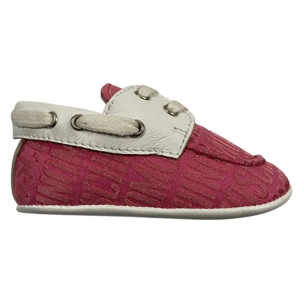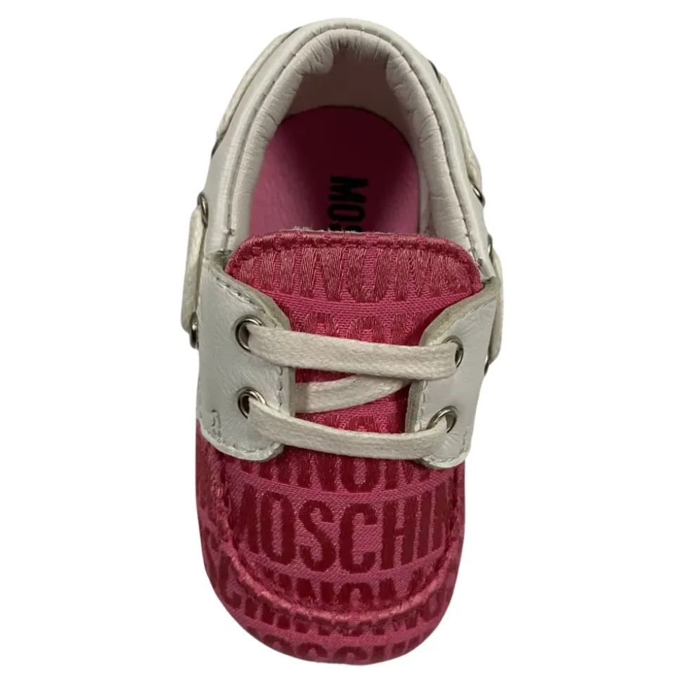 Moschino Piarosa Pre-walker Sko kombinerer en overdel med all-over logo med kontrasterende hvide glatte læderindsatser for nemme, daglige første skridt. Fremstillet i Italien. Vigtige egenskaber: Pink | Læder | Snørelukning | All-over logoprint | Kontrasterende hvide glatte læderindsatser | Rund tå | Sammensætning & pleje: Læder
