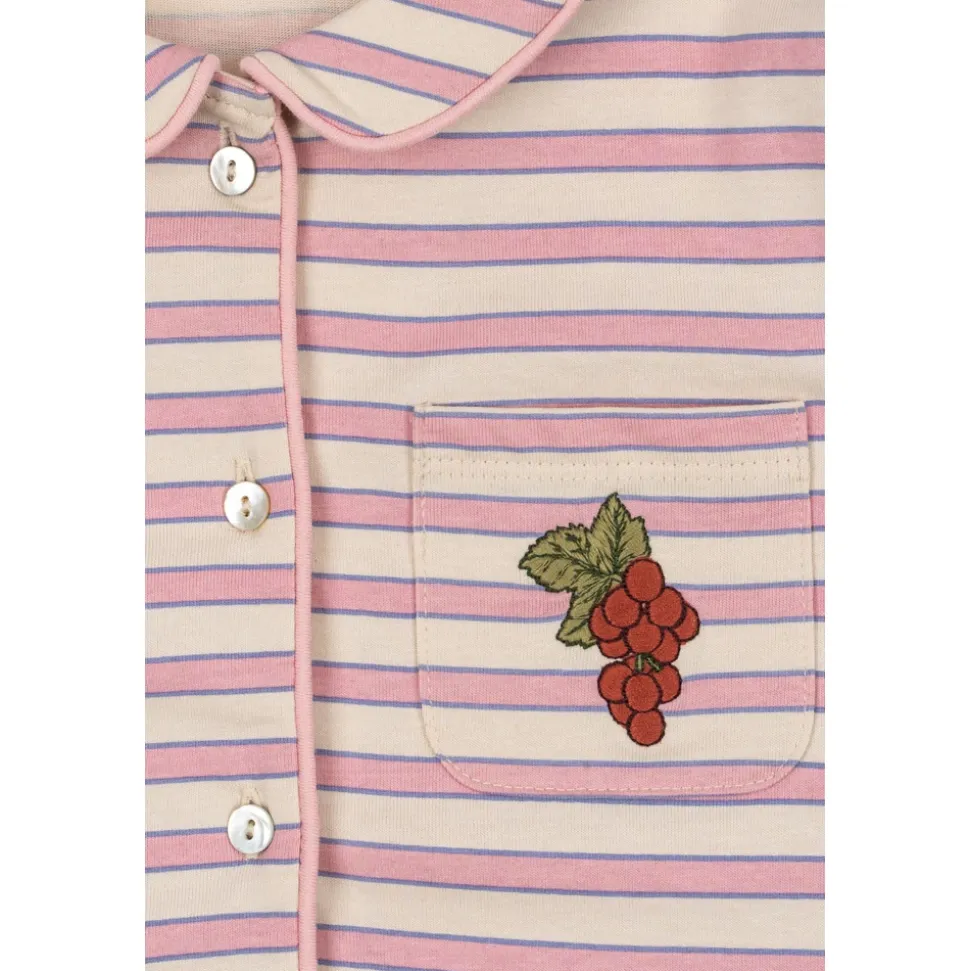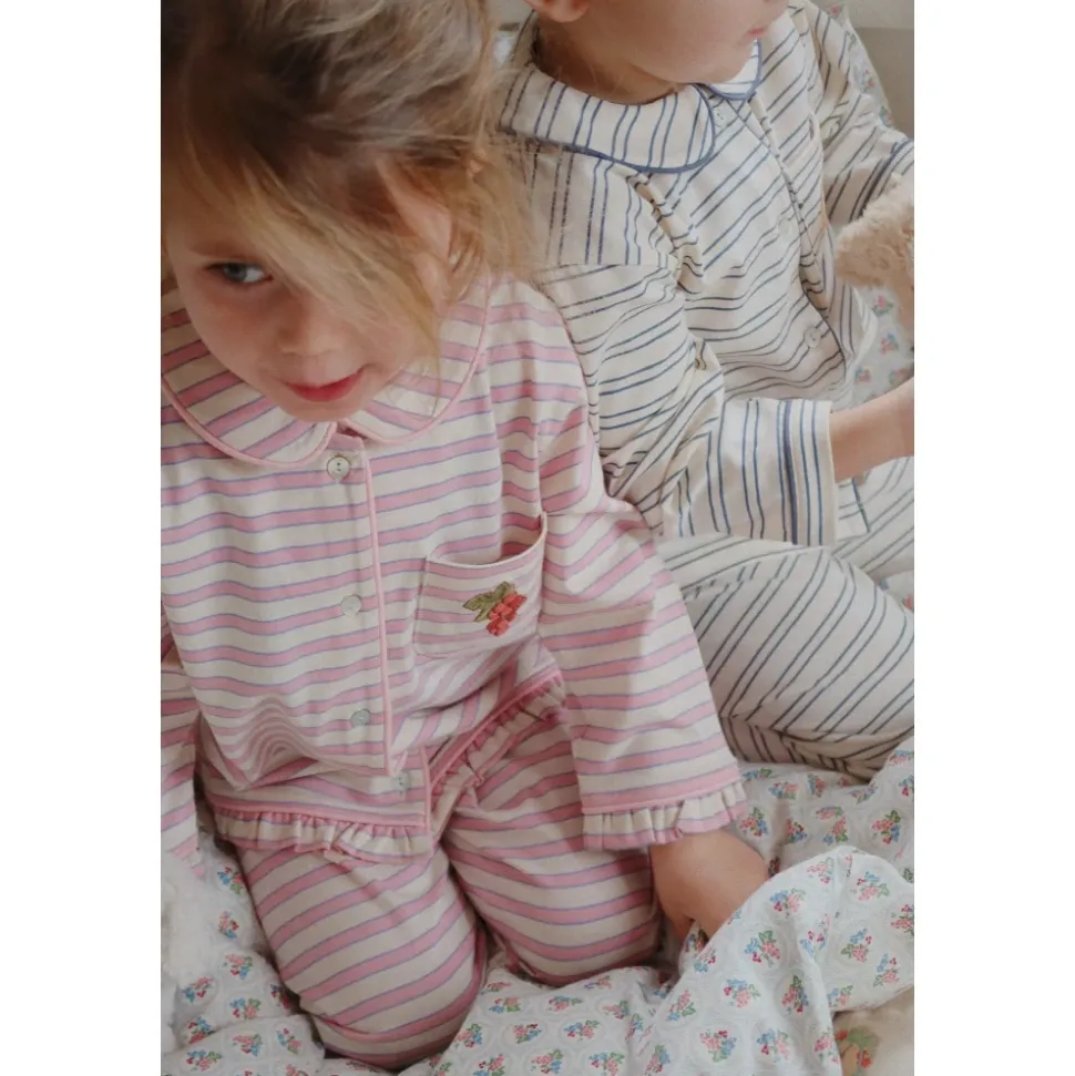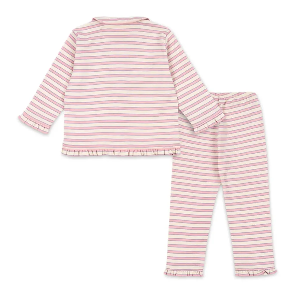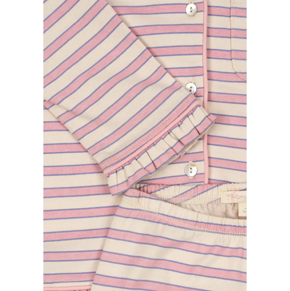 Konges Sløjd Pio Sæt er et todelt stribet pyjamassæt, der kombinerer en blød bomuldsfinish med fine designdetaljer. Sættet er ideelt til behageligt nattøj og afslappet hjemmetøj, fremhævet af et subtilt stribemønster og flæsekanter. Nøgleattributter: Pink | Creme | Bomuld | Blød fornemmelse | Åndbart stof | Knaplukning foran | Elastisk linning | Brystlomme med applikation | Vandret stribemønster | Peter Pan-krave med piping | Feminine flæser | Broderede kantdetaljer | Applikation med ribs-motiv | Lange ærmer | Dimensioner og pasform: Løs pasform | Afslappede bukser med elastisk linning | Sammensætning og pleje: 100% bomuld | Maskinvask ved 30°C. Stryg ved lav varme.