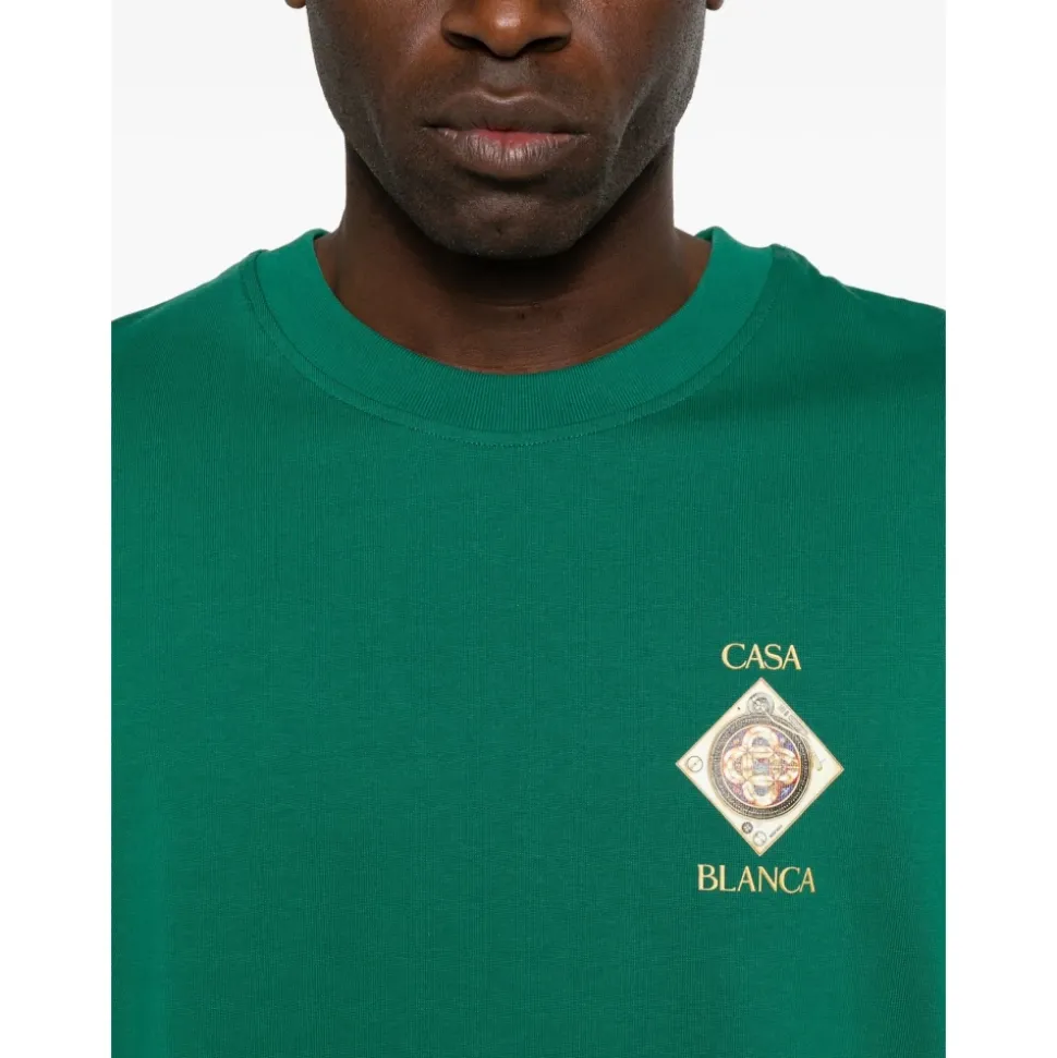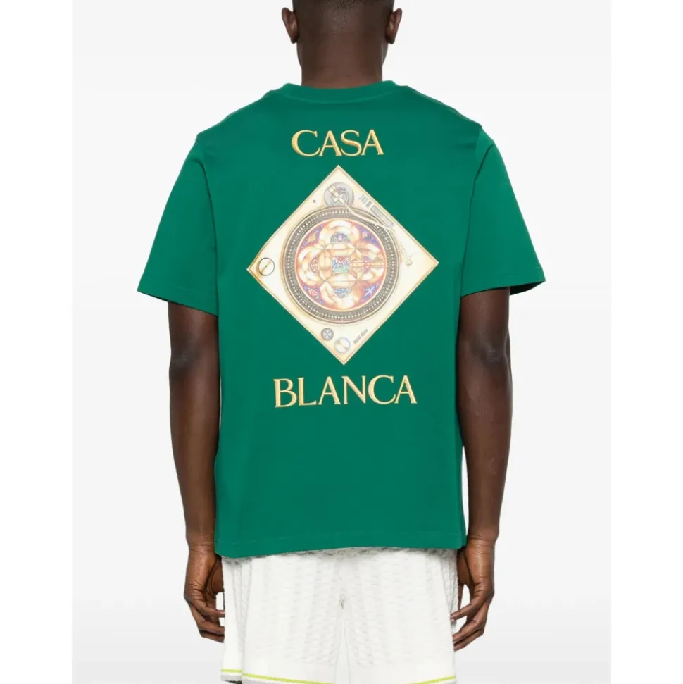 Casablanca Plafond orne de musique Classic T-shirt kombinerer et markant grafisk logo med en rund halsudskæring til hverdagsbrug. Vigtige egenskaber: Grøn | Rund halsudskæring | Korte ærmer | Grafisk logoprint | Klassisk T-shirt-styling | Dimensioner og pasform: Klassisk pasform
