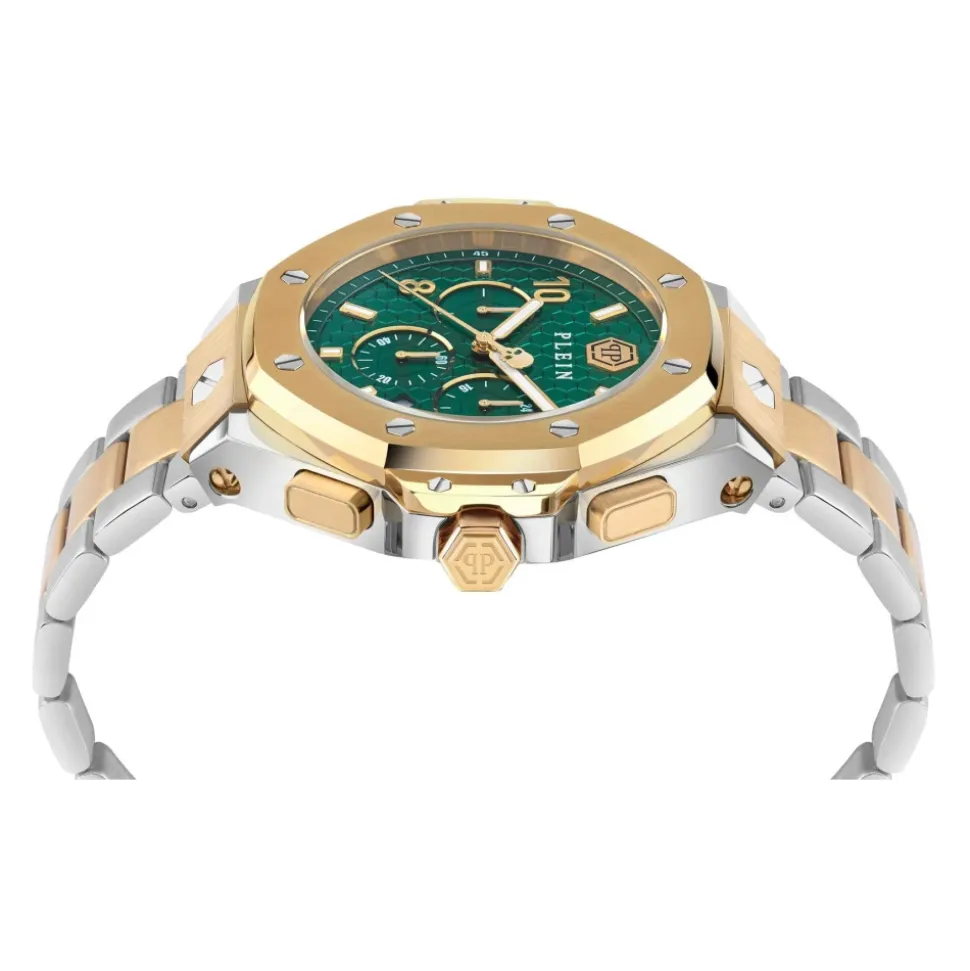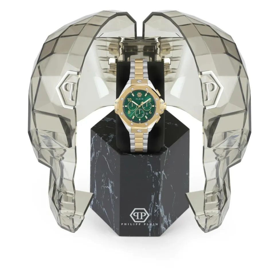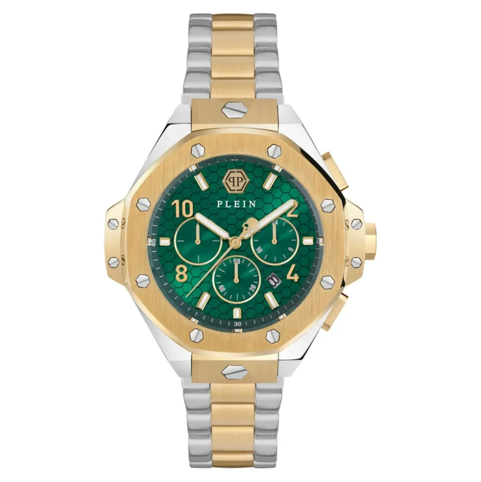 Philipp Plein Plein Chrono Royal kombinerer et tofarvet urkasse og armbånd i rustfrit stål med en grøn urskive med et sekskantet mønster. Uret tilbyder kvartspræcision og 5 ATM vandtæthed for pålidelig hverdagsbrug. Vigtigste egenskaber: Gul | Uni | Rustfrit stål | Vandtæt til 5 ATM | Kvarts urværk | Kronograffunktion | Leveres i gaveæske med kraniummotiv | Grøn urskive med sekskantet mønster | Guldfarvet-sølvfarvet tofarvet finish | Urkasse og armbånd i rustfrit stål | Sammensætning & pleje: Rustfrit stål