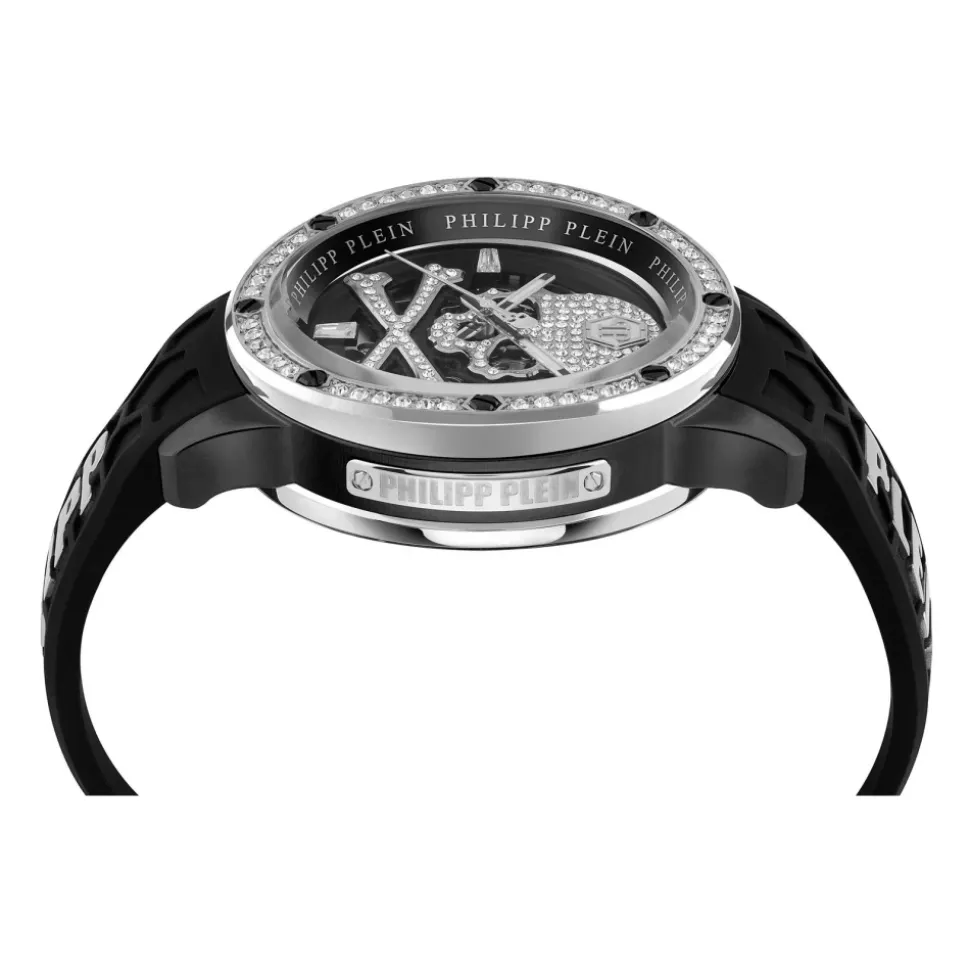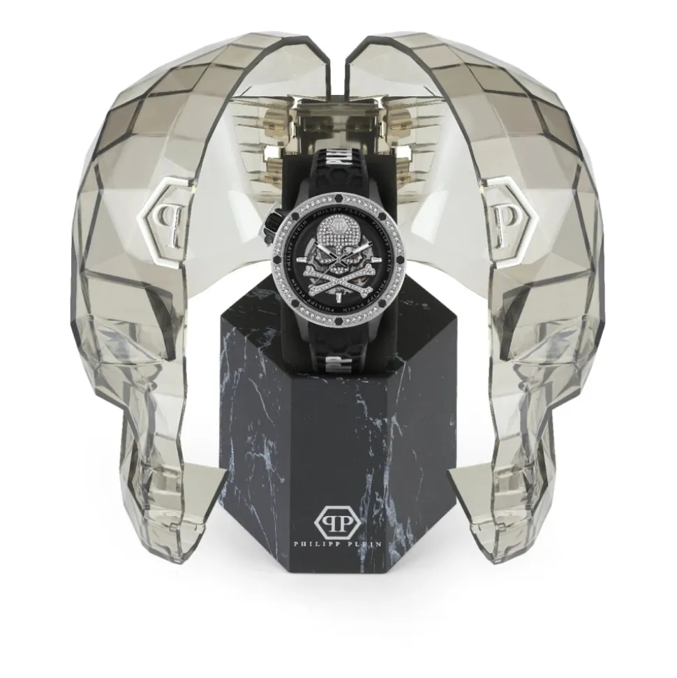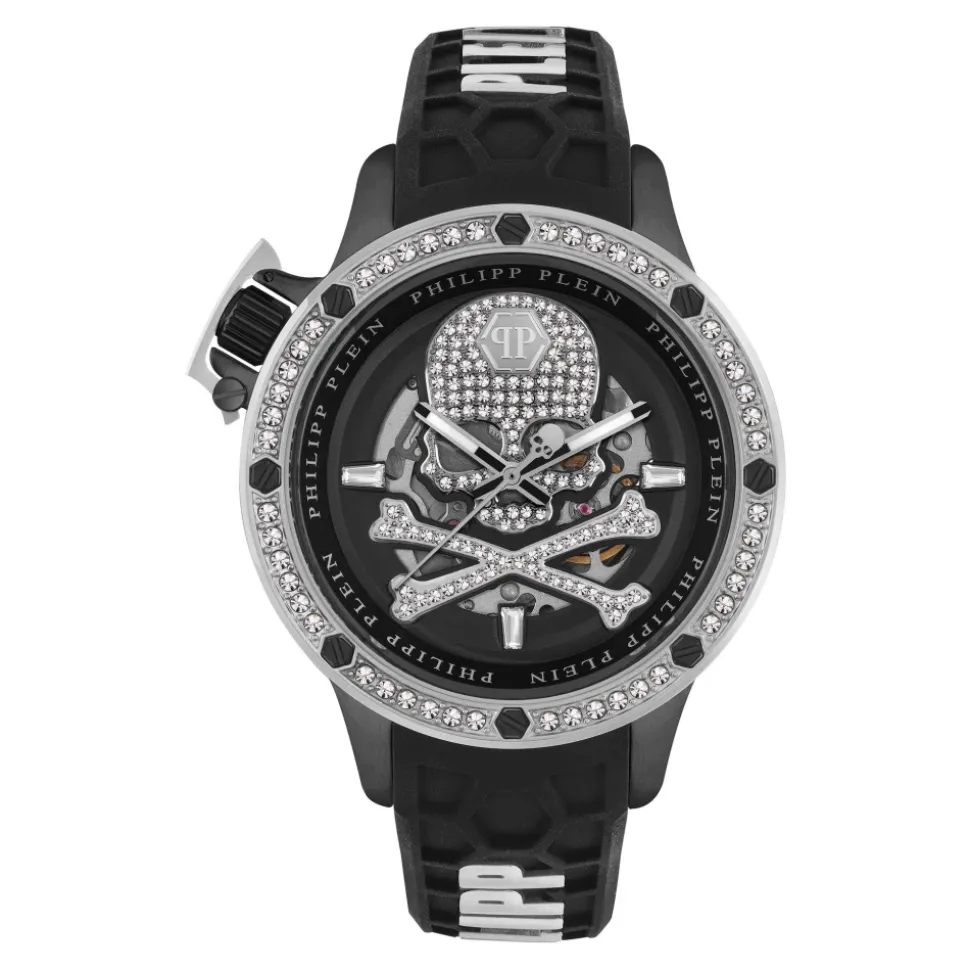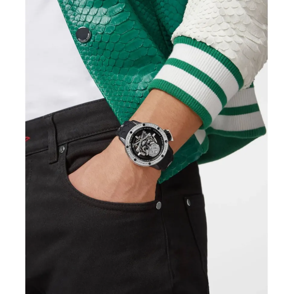 Opgrader din accessoriesamling med Philipp Plein Plein Rich 46mm Uret, et markant stykke med en slående sort IP-kasse og en sølvfarvet urskive. Produkt detaljer: Sort | Sølv | Rustfrit stål | Vandtæt op til 5 ATM | Automatisk urværk | Sort silikonerem | Bezel prydet med 189 krystaller | Kraniummotiv på urskiven | Sammensætning og pleje: Rustfrit stål | Silikone | Aftør med en blød klud.