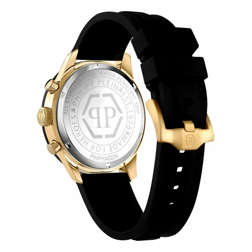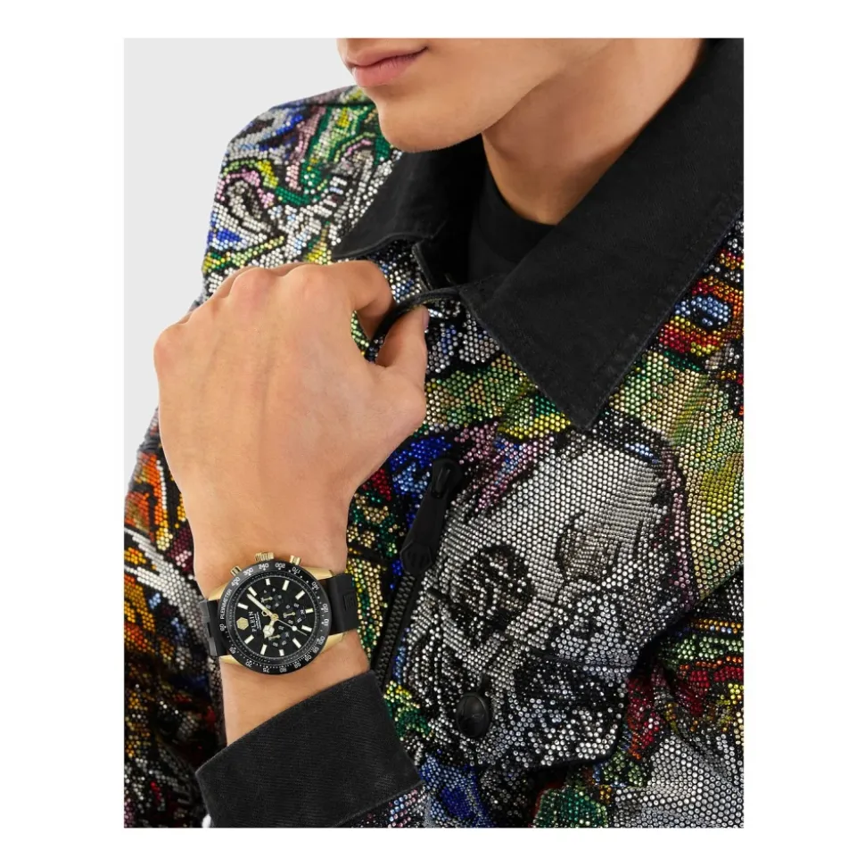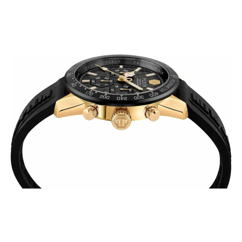 Philipp Plein Pleinmeter Chronograph kombinerer et dristigt IP-guld design med sports-klar funktionalitet. Den kombinerer en tekstureret sort urskive med præcis kronograftiming til hverdagsbrug og særlige lejligheder. Nøgleattributter: Gul | Guld | IP guld | Vandafvisende til 10 ATM | Kronograffunktion | Quartz urværk | Holdbar silikonerem | 44 mm IP-guld urkasse | Tekstureret guilloche sort urskive | Fremtrædende kronograf subdials | Dimensioner og pasform: Urkassediameter: 44 mm | Sammensætning og pleje: IP guld (urkasse) | Silikone (rem) | Quartz urværk
