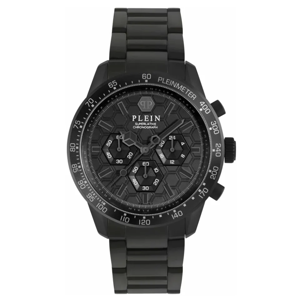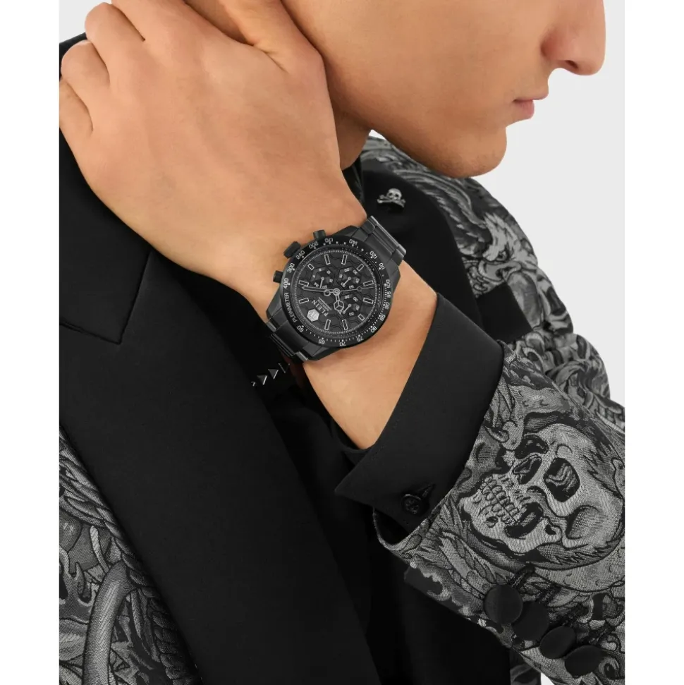 Philipp Plein Pleinmeter Chronograph kombinerer sportsinspireret tidsmåling med en raffineret sort IP-belagt konstruktion i rustfrit stål. Uret fremhæver praktiske funktioner – kronograf, tachymeter og en 24-timers visning – til aktiv hverdagsbrug. Nøgleattributter: Sort | Schwarz | Rustfrit stål | Vandafvisende til 10 ATM | Kronograffunktion | 24-timers subdial | Datovindue | Foldespænde på armbånd i rustfrit stål | Sort IP-belagt urkasse | Tachymeterskala | Ledarmbåndsdesign | Sammensætning & pleje: Rustfrit stål | IP sort belægning
