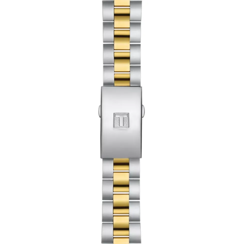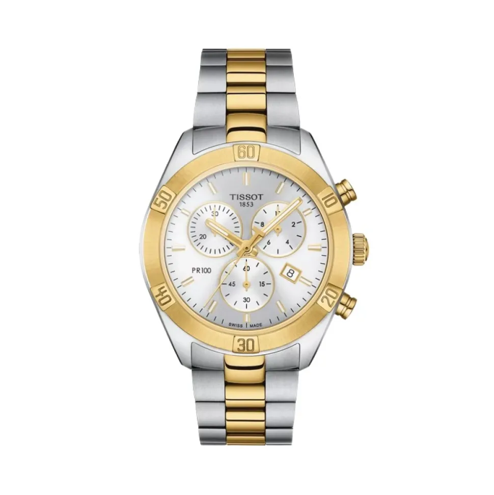 Tissot PR 100 Sport Chic Chronograph kombinerer et klassisk, hverdagsdesign med chronograph-funktionalitet. Den er bygget til daglig brug med en tofarvet finish i rustfrit stål og et pålideligt schweizisk quartz-urværk. Nøgleattributter: Sølv | Grå | Guld | Rustfrit stål | 316L rustfrit stål | Vandafvisende op til 10 bar (100 m) | Ridsefast safirglas | Schweizisk quartz-urværk | Chronograph med 60 sek., 30 min. og 12 timers tællere | Foldespænde med trykknapper | Datovisning | Tofarvet finish med guldfarvede PVD-bezeldetaljer | Solbørstet sølvfarvet urskive med timeindeks | Selvlysende visere for synlighed i svagt lys | Tre sub-dials og datovindue ved kl. 4 | Mål og pasform: Urkassediameter: 38,00 mm | Urkassetykkelse: 10,5 mm | Rembredde: 19 mm | Sammensætning og pleje: 316L urkasse i rustfrit stål med guldfarvet PVD-belægning | Armbånd i rustfrit stål | Safirglas | Aftørres med en blød klud. Undgå kontakt med kemikalier og ekstreme temperaturer. Udskift batteri og tæthedsforseglinger på et autoriseret servicecenter.