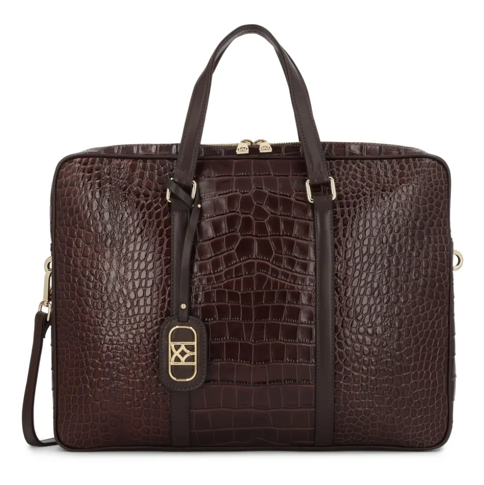 Denne stilfulde laptop-taske lavet af brunt læder præget med et krokodillemønster kombinerer elegance og funktionalitet i et luksuriøst design. Den teksturerede finish tiltrækker opmærksomhed og giver tasken et karakteristisk, klassisk præg, der passer perfekt til forretnings- og formelle outfits. Tasken er udstyret med to robuste håndtag til bæring i hånden og en aftagelig skulderrem, der sikrer komfort i forskellige situationer. De guldfarvede metaldele tilføjer prestige, og det veludformede interiør med passende stivhed beskytter effektivt din bærbare computer og andre essentielle tilbehør. Denne smarte taske er det perfekte valg for dem, der værdsætter høj kvalitet, elegance og et professionelt image – ideel til både arbejde og forretningsmøder. Produkt detaljer: Tasken har et hovedrum lukket med lynlås. Inde i rummet er der 1 lynlåslomme og 1 stor lomme lukket med en magnetisk trykknap. Den aftagelige rem er justerbar i længden.