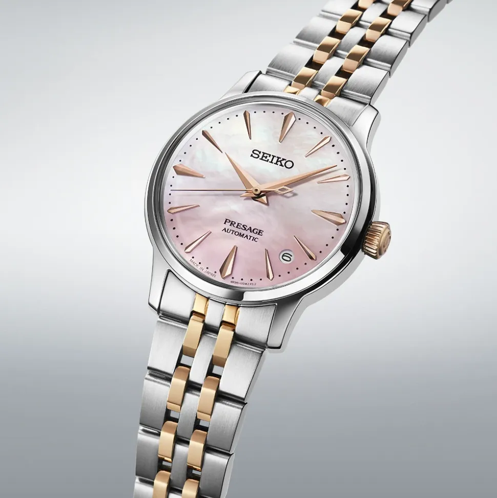 Seiko Presage Cocktail Time kombinerer en lyserød perlemorsskive med et automatisk 4R35 urværk og tilbyder et kompakt 34 mm dressur, der er velegnet til hverdagsbrug og formelle lejligheder. Nøgleattributter: Lyserød | Stål | Rosaguld | Rustfrit stål | Vandtæthed 5 bar | Automatisk urværk (Kaliber 4R35) | Ca. 41 timers gangreserve | Datovisning | Foldelås med trykknapudløsning | Skruekrone | Limited edition med indgraveret serienummer | Perlemorsskive | Rosaguld-farvede visere og indekser | To-farvet armbånd | Kasseformet Hardlex krystal | Dimensioner og pasform: Kassediameter: 34,00 mm | Lug-to-lug: 40,4 mm | Afstand mellem horn: 17 mm | Sammensætning og pleje: Rustfrit stål | Hardlex krystal | Perlemor