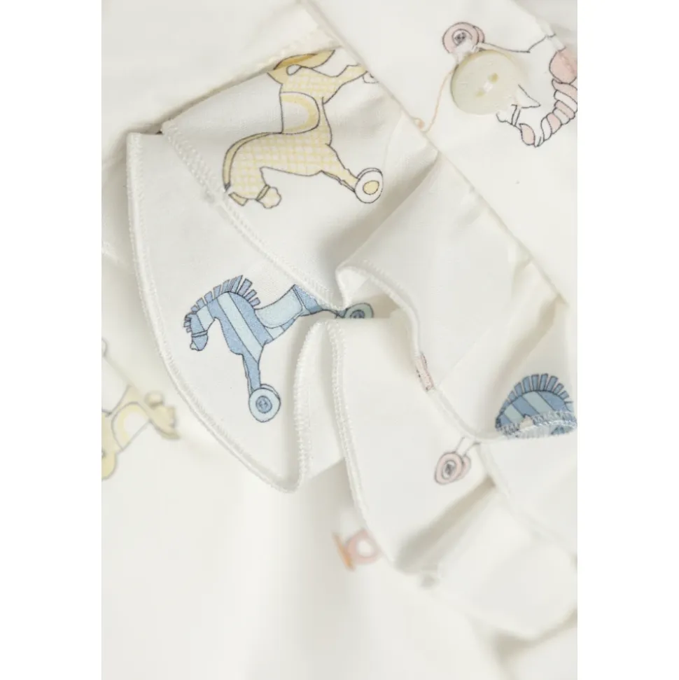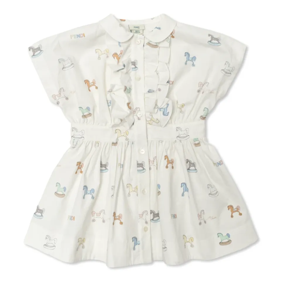 Fendi Printet Kjole kombinerer en klassisk, udvidet silhuet med et delikat pastelgynghesteprint, der balancerer raffinerede detaljer og hverdagsagtig komfort. Afrundet krave og flæsekantet knaplinje tilføjer en distinkt finish, mens blød bomuld sikrer en behagelig følelse. Vigtigste egenskaber: Hvid | Bomuld | Åndbar bomuld | Knaplukning | Klassisk udvidet snit | Korte sommerfugleærmer | Afrundet krave med flæsekant | Rynket talje, der flyder ud i en udvidet nederdel | Pastelgynghest all-over print | Udtalt håndværksmæssig rynkning | Dimensioner & pasform: Klassisk udvidet snit med et figursyet livstykke og rynket talje | Sammensætning & pleje: Bomuld