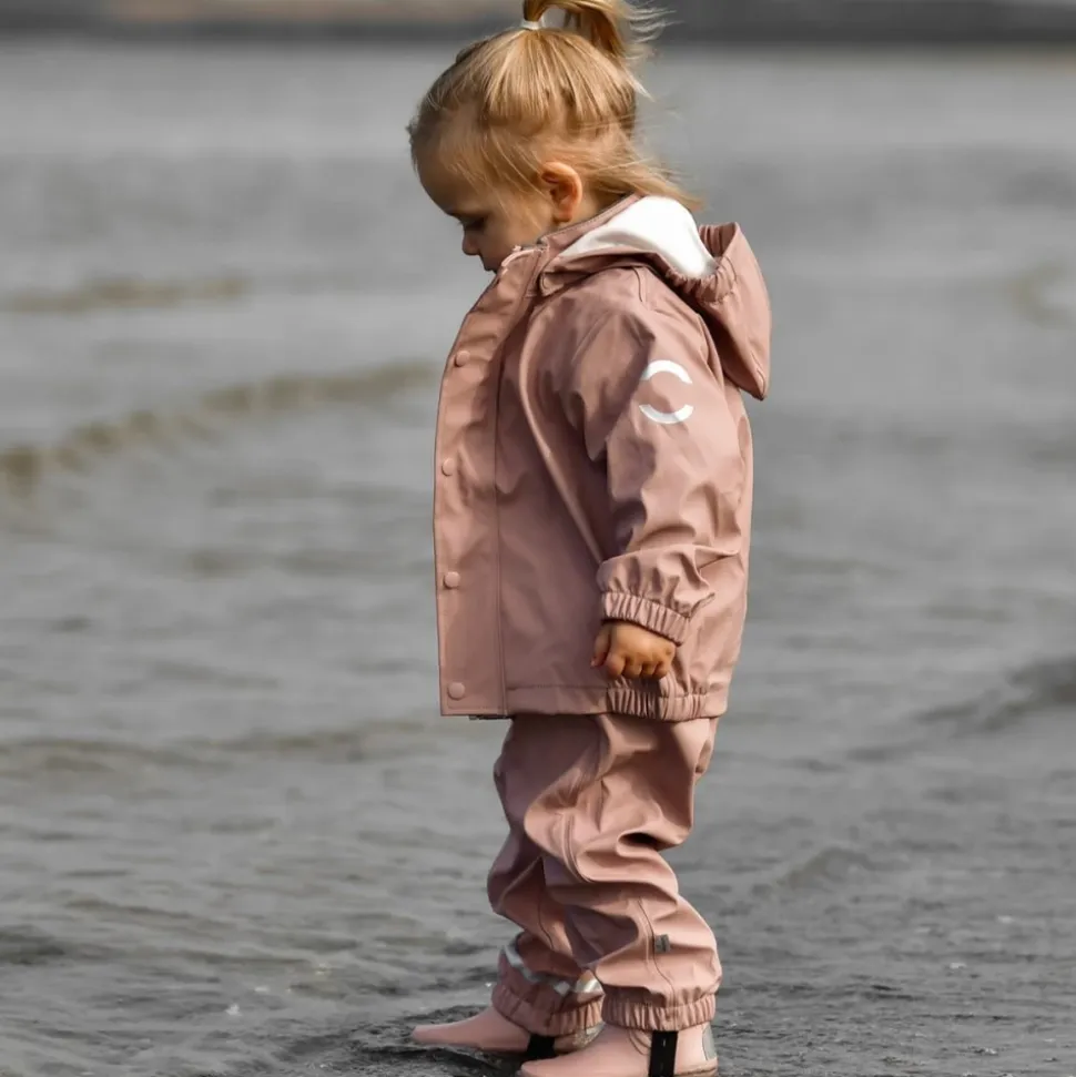 Hold dit barn tørt og stilfuldt med dette praktiske og funktionelle genanvendte regnsæt fra danske Mikk-Line. Sættet inkluderer en jakke og bukser i en smuk lyserød farve. Udstyret med reflekterende detaljer for sikkerhed i mørket, er dette regntøj både vand- og vindtæt med svejsede sømme for at forhindre vand i at trænge igennem. Bukserne har fodstropper for at holde dem på plads under gummistøvler, og justerbare seler til størrelser 74-104. Hold dit barn tørt og sikkert med dette Mikk-Line PU Rain Set W. Susp. .