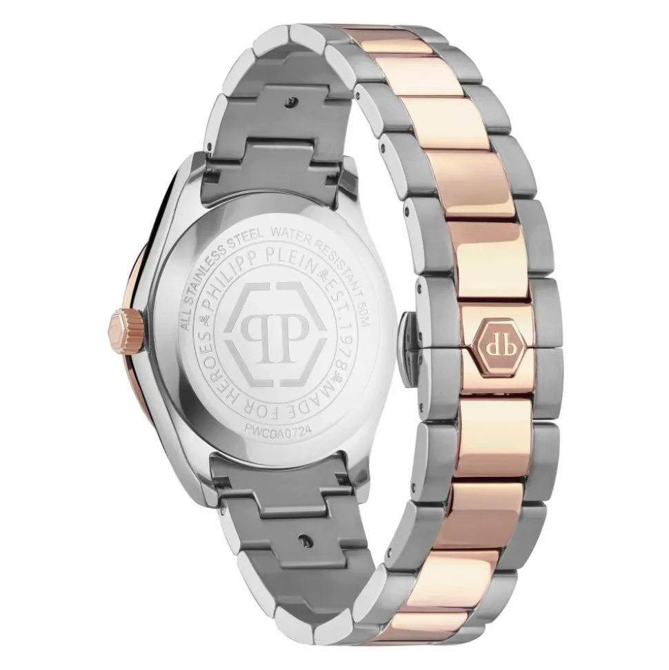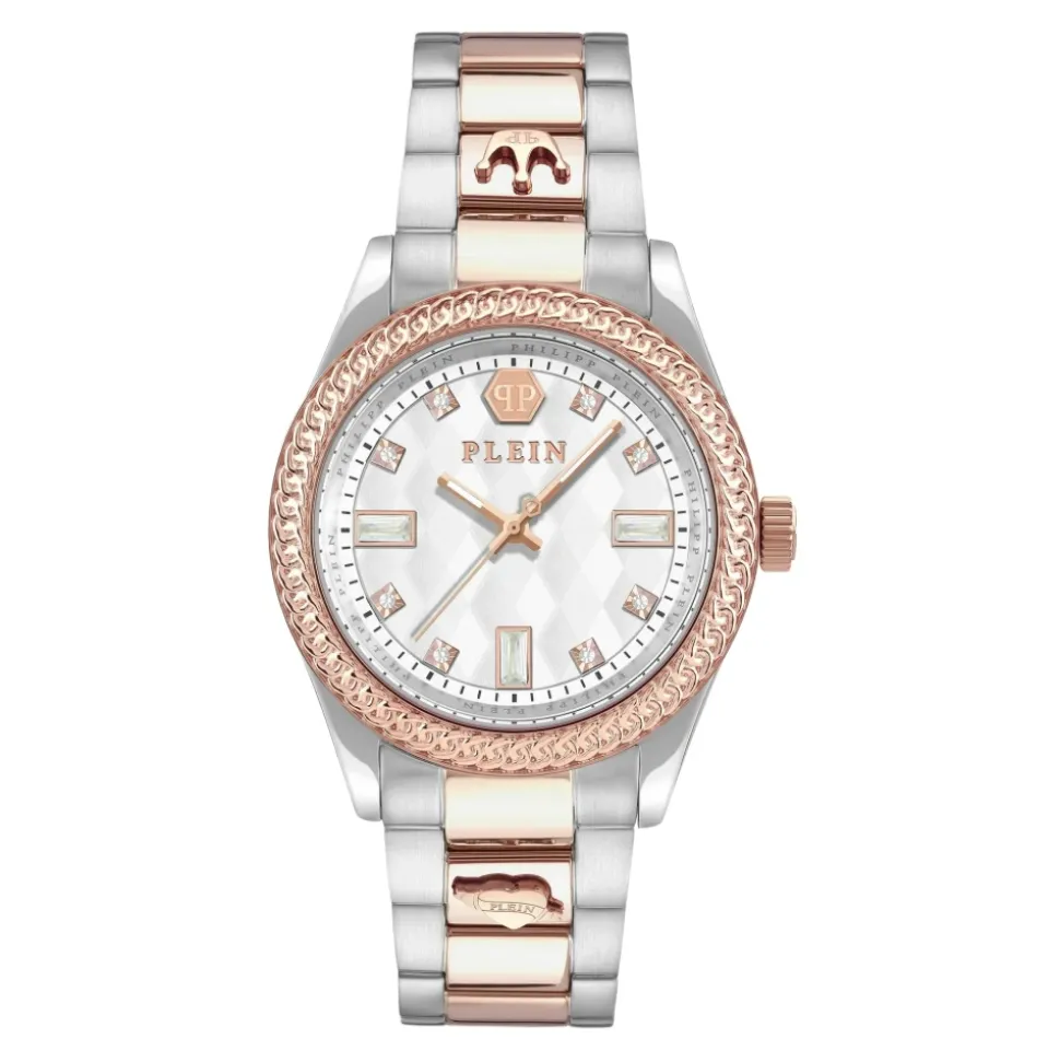 Philipp Plein Queen Crystal PWCDA0724 kombinerer et tofarvet design i rustfrit stål med funklende krystalindeksmarkeringer for et elegant hverdagslook. Nøgleattributter: Grå | Sølv | Rustfrit stål | Vandafvisende op til 5 ATM | Præcis kvartstidtagning | Kvarts urværk | Tofarvet design (sølv og rosaguld) | 11 krystalindeksmarkeringer | Guilloché-skive | Dimensioner og pasform: 38 mm urkassediameter | Perfekt proportioneret til mindre håndled | Sammensætning og pleje: Rustfrit stål